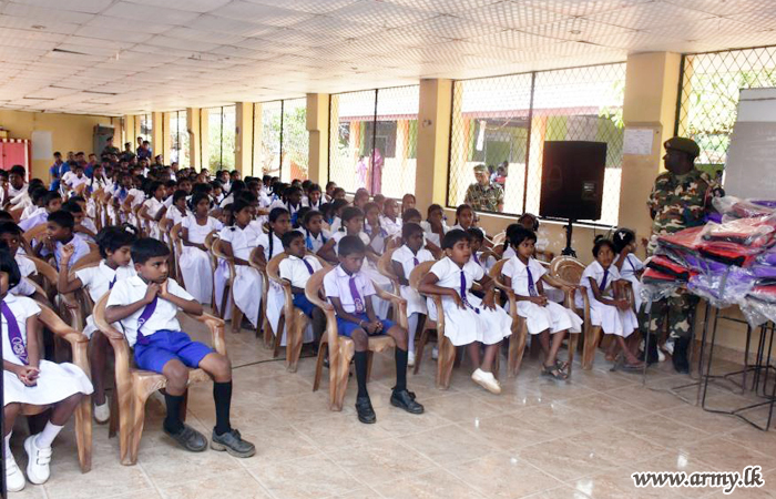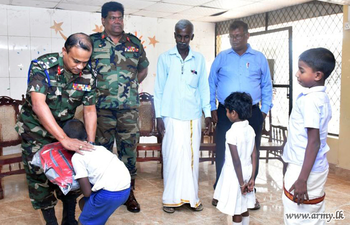 A total of 170 children who did not receive those school aids earlier during two phases, launched by the Security Force Headquarters - Mullaittivu (SFHQ-MLT) with same sponsors were benefited due to this donation. Both SFHQ-MLT and Security Force Headquarters - Kilinochchi (SFHQ-KLN) in the past couple of months have been launching these welfare projects for the benefit of flood-affected student community in Mullaittivu.