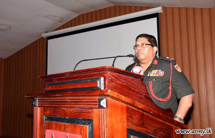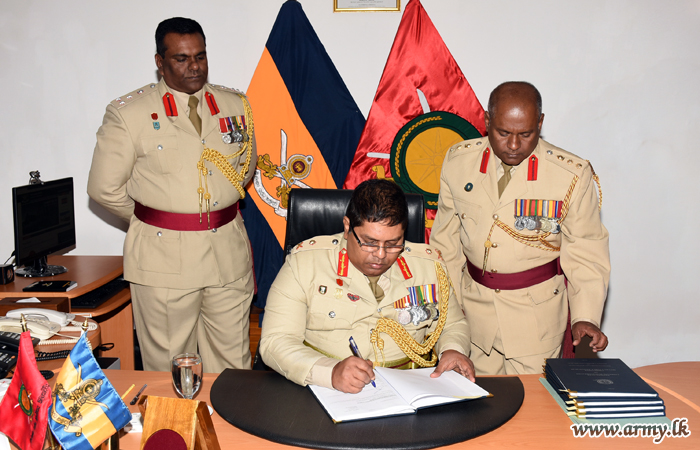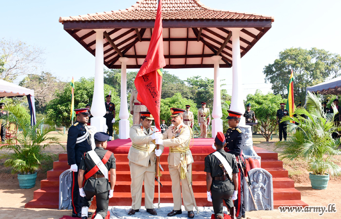 During the military ceremony in the parade ground, the outgoing Commander, Security Force Kilinochchi, symbolizing the formal relinquishment of office, handed over the official flag of the Security Force Headquarters - Kilinochchi to the new Commander, Major General G. Vijitha Ravipriya who was serving the 57 Division. The outgoing Commander afterwards placed his signature in a formal document to symbolize the relinquishment of his office and spoke to his staff in the office.
