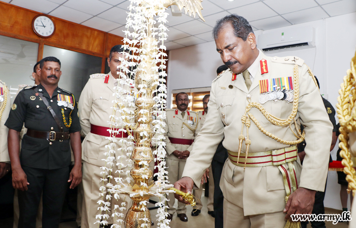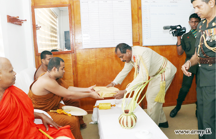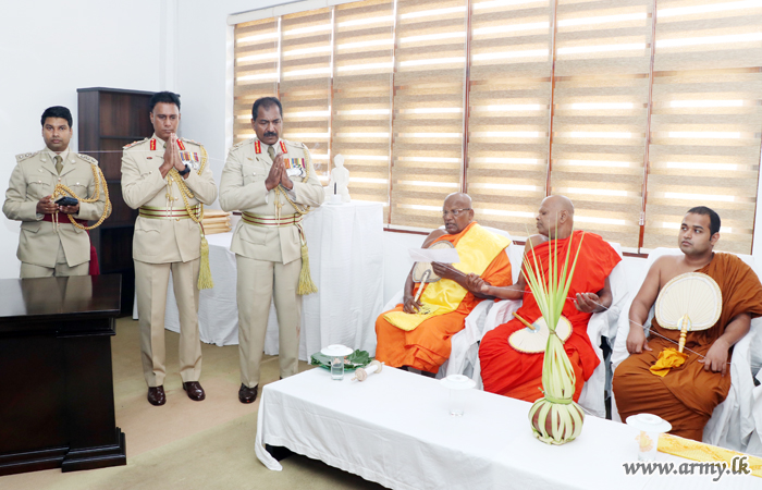 A few minutes later, the new Commandant entered his office and observed religious observances after lighting the traditional oil lamp. After Major General Liyanage offered the tray of betel as a formality to the members of the Maha Sangha, he participated in a brief blessing ceremony.