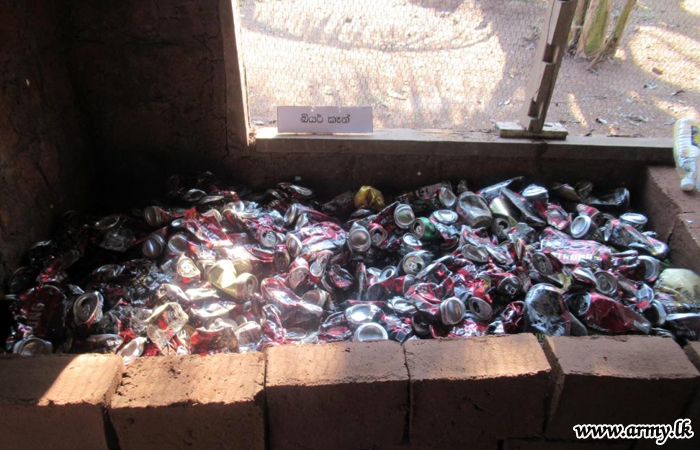 The project, a new feature introduced on an initiative of the Colonel, Administration & Quartering (Col-AQ) of the 65 Division, Colonel Nalinda Ariyasena under the guidance of Major General Wasantha Kumarapperuma, General Officer Commanding (GOC) 65 Division has begun buying cardboard (Rs 10 per kg), plastics (Rs 50 per kg), energy and drink bottles (Rs 50 per kg), plastic bottles (Rs 10 per kg), tins (Rs 6 per kg), white glass pieces (Rs 5 per kg), brown glass pieces (Rs 2 per kg), green glass pieces (Rs 1 per kg) and yoghurt cups (Rs 2 per kg).