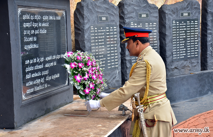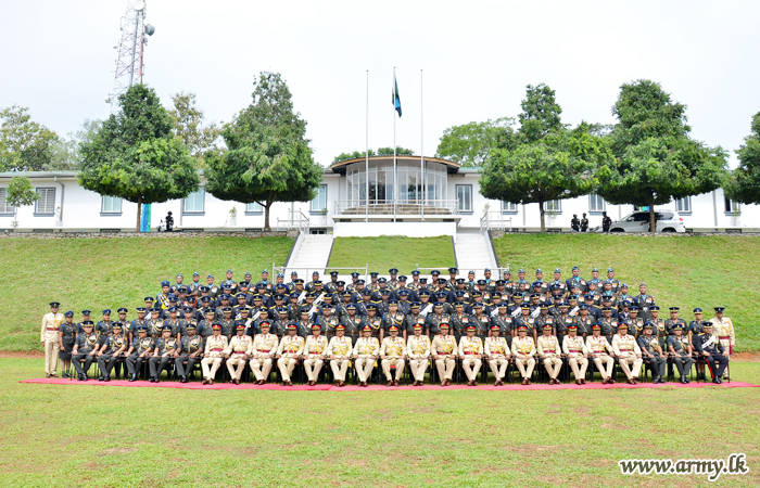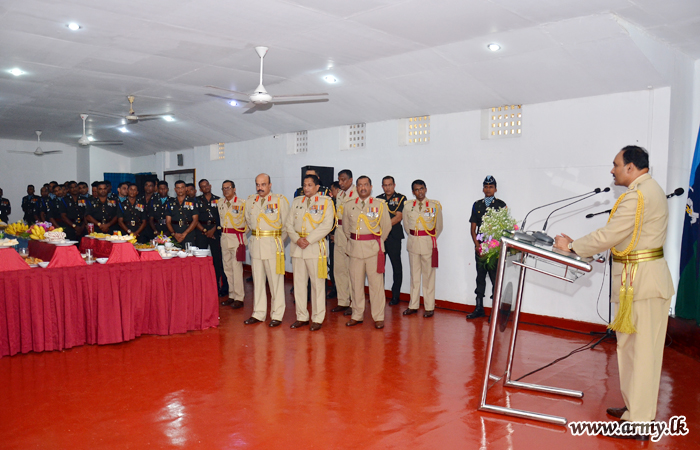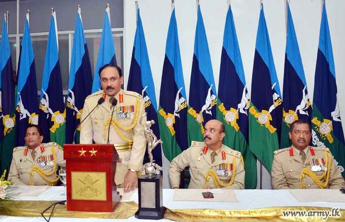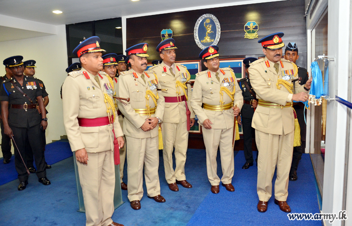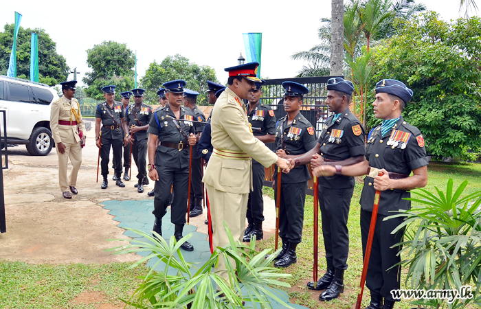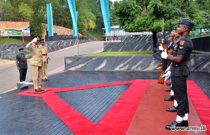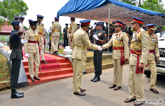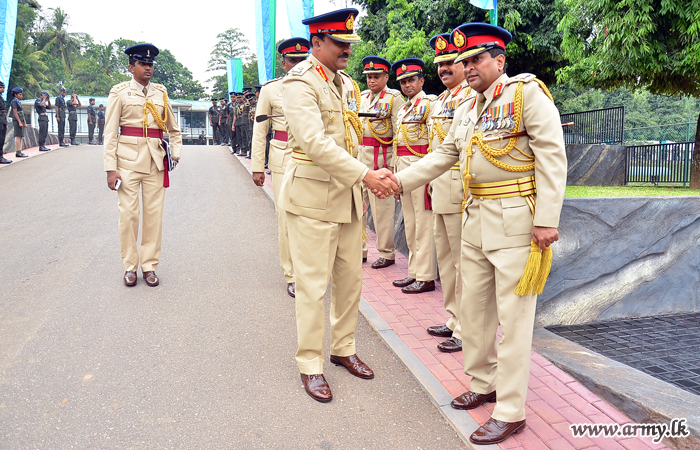 On arrival Major General Wijesinghe was greeted in a Guard Turnout before he was warmly received by the SLSC Centre Commandant, Brigadier L.S.P Perera and Senior Officers. He was afterwards invited to receive the salute in the Guard of Honour, presented by troops of SLSC regular and volunteer units in the Regimental parade ground.