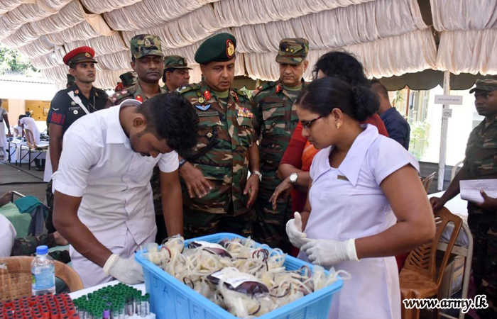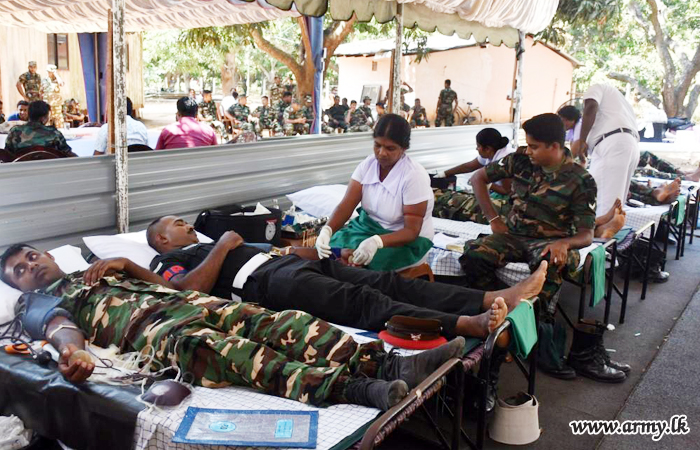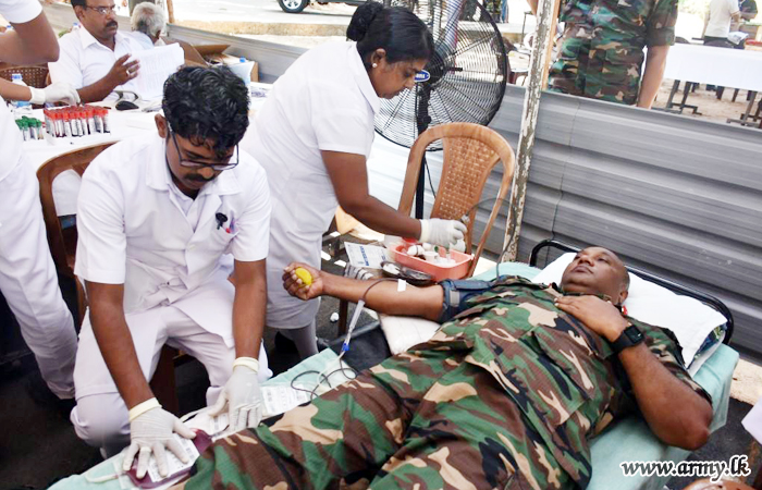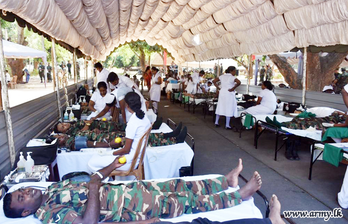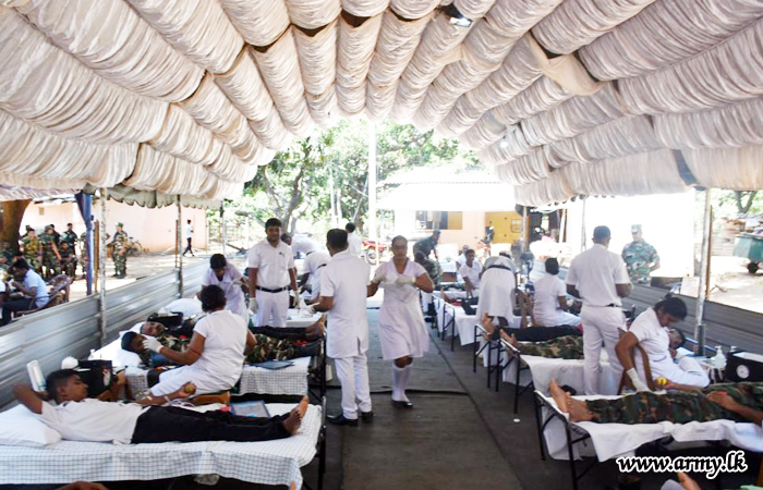 More than 500 troops serving the 59, 64, 68 Divisions and the Forward Maintenance Area - Mullaittivu under the Security Force Headquarters - Mullaittivu as a tribute to the memory of fallen War Heroes in the wake of the forthcoming National War Heroes’ Day (May 19), donated blood to the Mullaittivu Base Hospital during the onset of the Vesak festival on Thursday (16).