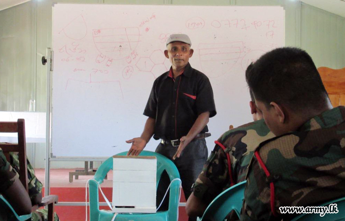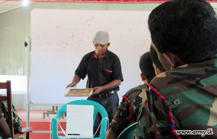 Two officials of the ‘Bingu Sampath Surakimu' Association, Mr Tissa Bandara Thambawita and Mr Nuwan Keerthiratne at the request of Brigadier Mangala Wijesundara, General Officer Commanding, 66 Infantry Division conducted a lecture session on Bee-keeping as a viable source of additional income to both Army personnel and civilians in Pooneryn areas on Thursday (16) at the 66 Division Headquarters.