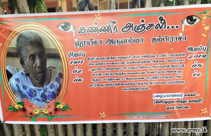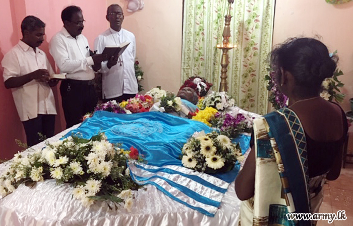 Major General Vijitha Ravipriya, Commander, Security Forces - Kilinochchi (SF-KLN) paid his last respects to late Mrs Luiza Arunaamma Thambirasa, the pioneering founder of the Navajeewanam Methodist Church - Murasamodai and a well-known social worker who is famed as ‘Mother of Church’ on Wednesday (22).