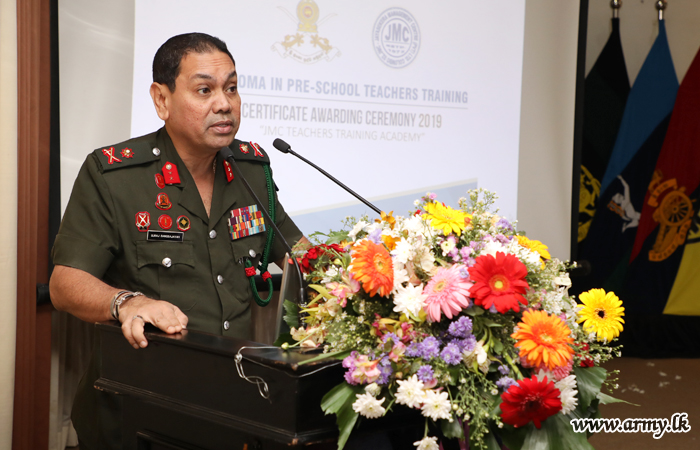 The training programme got underway in collaboration with the Jayasekara Management Centre (JMC) under the coordination and supervision of the Army Directorate of Training. Major General M Mudannayake, Colonel Commandant, SLAWC provided guidelines for conduct of this course since the Army Seva Vanitha Unit-managed pre-schools would need their services in the long run due to their popularity.