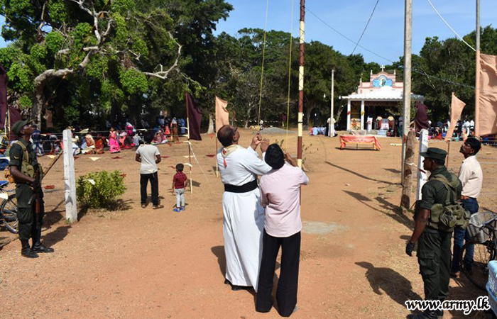 11 (Volunteer) Gajaba Regiment of the 651 Brigade, deployed to provide security for the annual feast at St Mary’s Church in the Grama Niladhari Division, Mulankavil on Sunday (16) took special care to provide drinking water for the devotees as it was a vital need for the occasion. Troops brought plastic water storage tanks to the location and provided water into them.