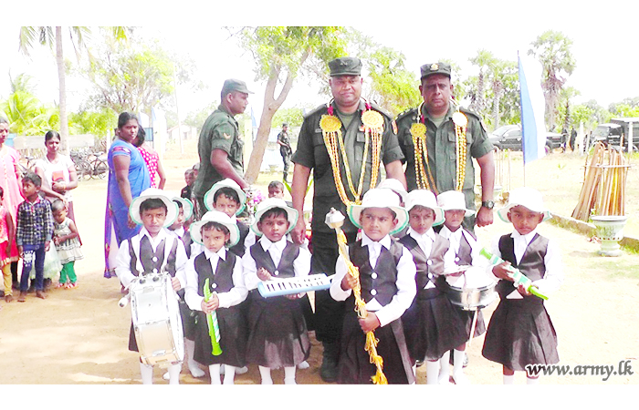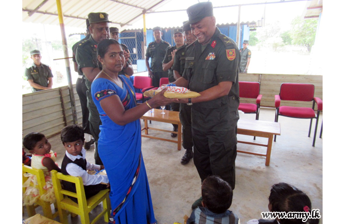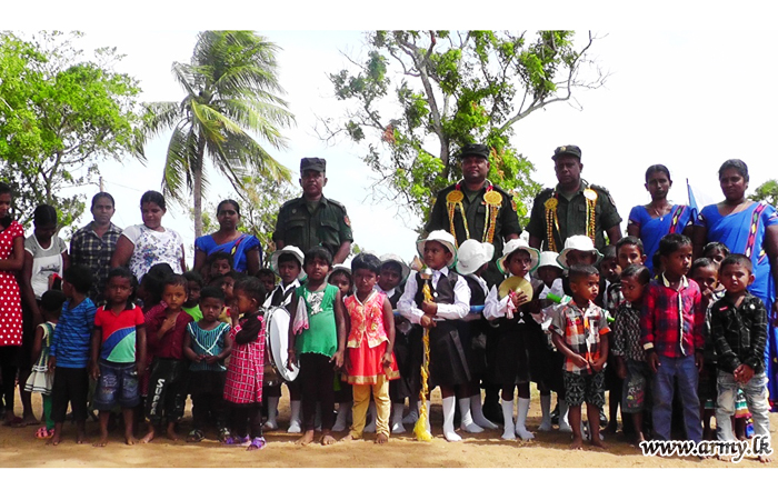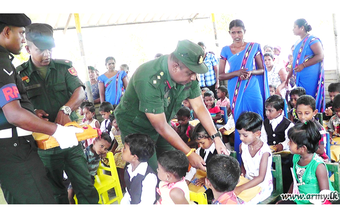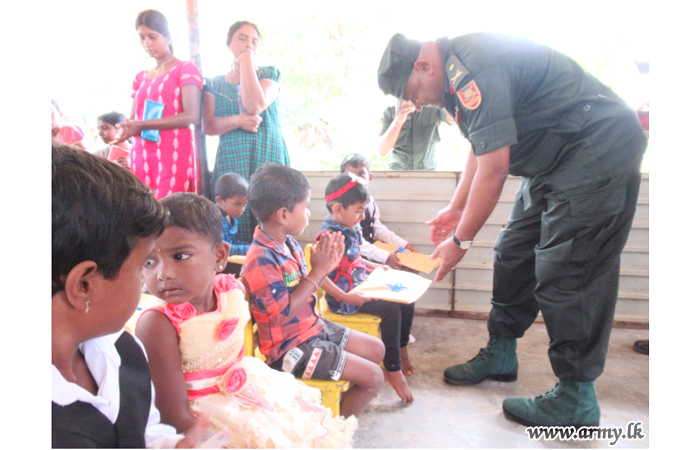 House Wives Association of Central Colombo following coordination made by 653 Brigade troops of the 65 Division under the supervision of the 653 Brigade Commander, Colonel J.A.J.L.B Udowita, together with 17 (Volunteer) Sri Lanka Light Infantry (SLLI) troops recently distributed a stock of books and accessories among under privileged pre-school kids at Therakandal, Kaleimagalan.