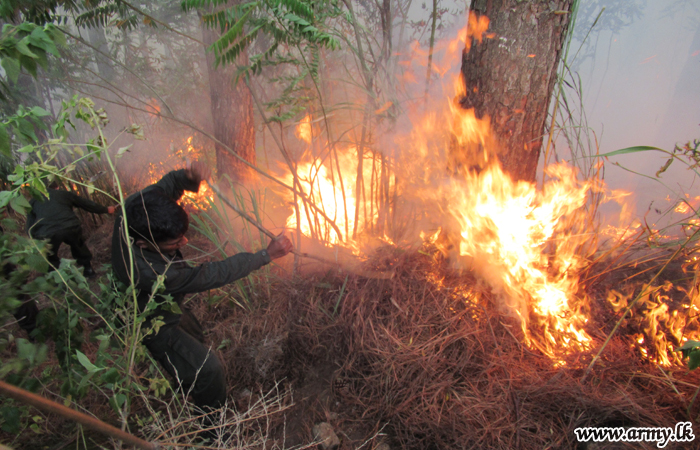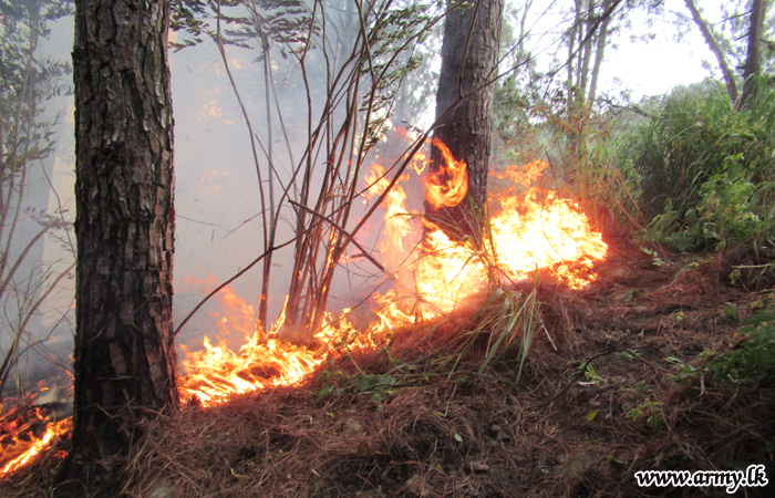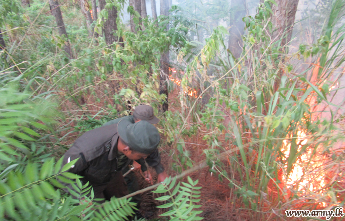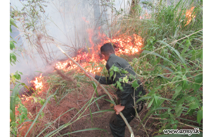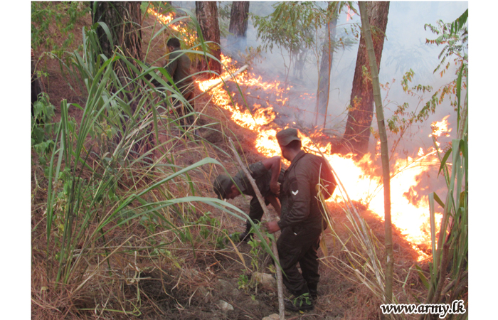 A group 21 troops including an Officer of the Security Force Headquarters- Central on being informed of a sudden bush-fire spreading across Dowa area, close to Bandarawela town rushed to the location and helped other volunteers to extinguish it on Tuesday (2).