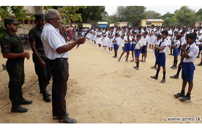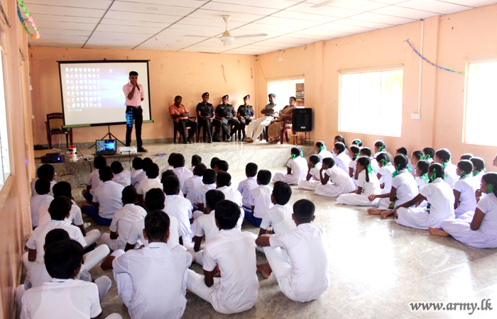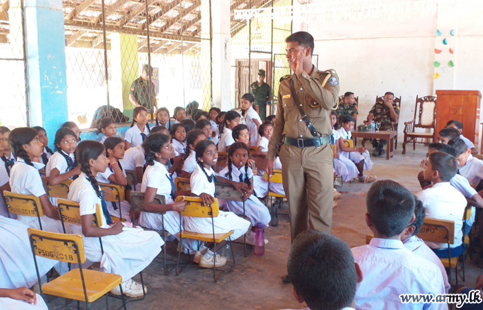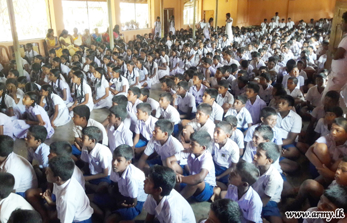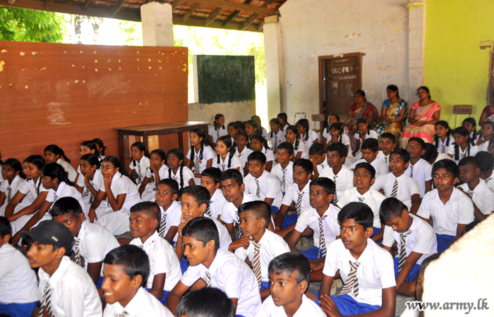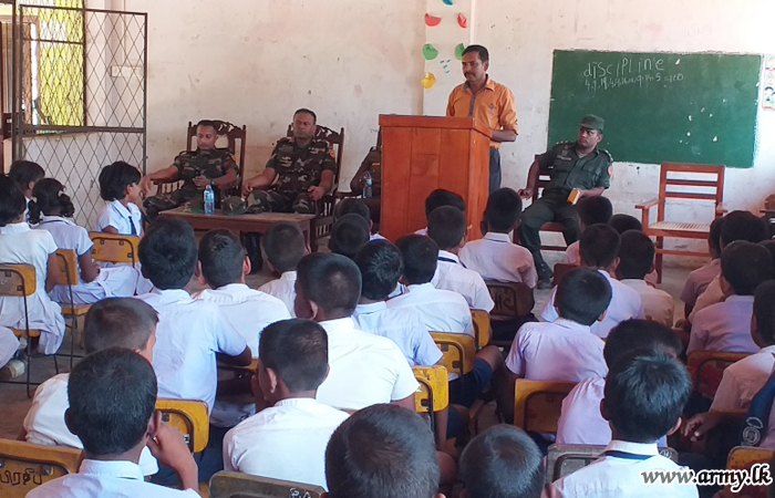 In the meantime, the troops of 11 (Volunteer) Gajaba Regiment, 20 (V) VIR and 7 SLNG on the directions of the Commander Security Forces Kilinochchi, Major General G.V Ravipriya held educative programmes on 28 June at Kariyalanagapadduwan No 02 School, Konavil School and Akkarayankulam School to be in parallel with the Presidential National Drug Prevention campaign.
