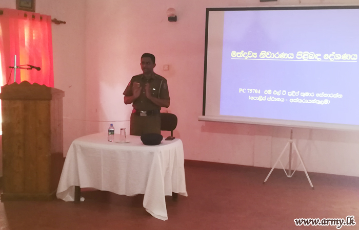 Meanwhile, Major General Wasantha Kumarapperuma, General Officer Commanding 65 Division, together with Commanders of 652 and 653 Brigades and their under command battalions, 10 Sri Lanka Light Infantry (SLLI) , 17 (Volunteer) SLLI and 20 (V) Vijayabhahu Infantry Regiment, organized drug prevention awareness programmes attended by 82 school children, 4 teachers, 4 officers 103 soldiers during 26 - 27 June at their respective places and in government schools. Similarly, 7 Sri Lanka National Guard troops conducted another awareness session with the support of Akkarayankulam Police officers.