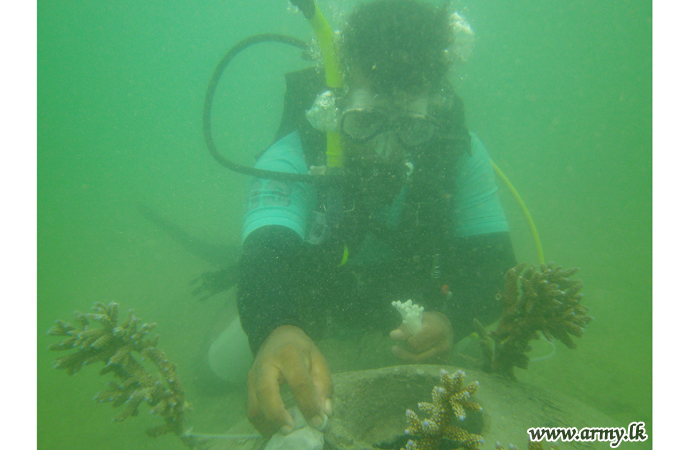 22 Division troops of the Security Force Headquarters-East joined hands with Marine Environment Protection Authority (MEPA) personnel and helped organize a Coral Conservation Project along the coastline in Trincomalee around 22 Division Headquarters premises on Saturday (27).