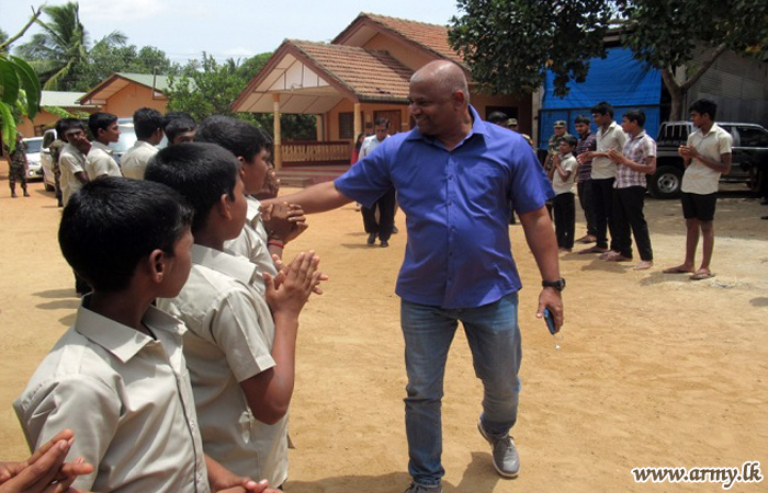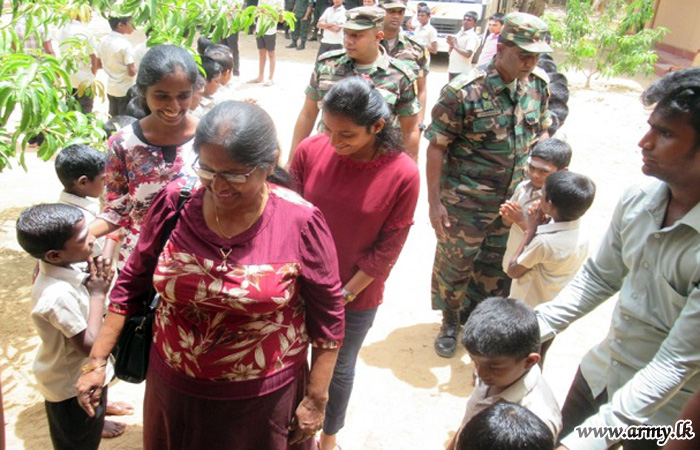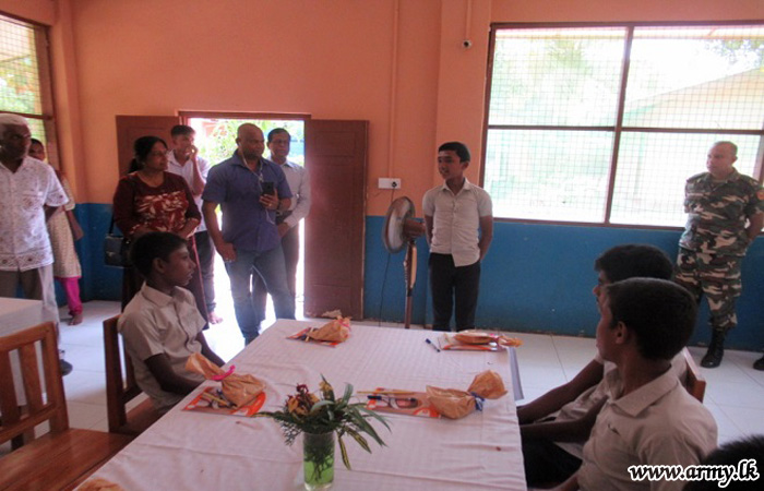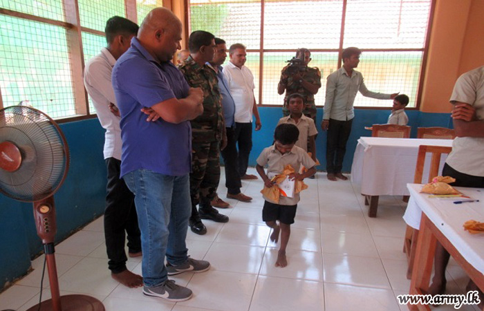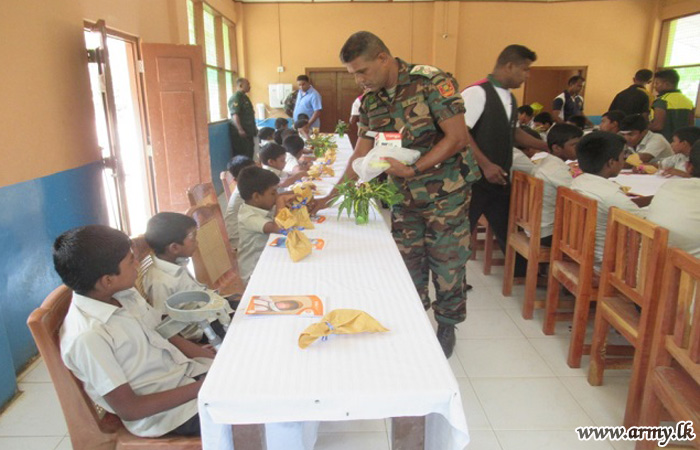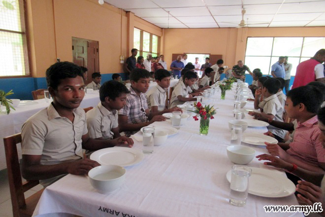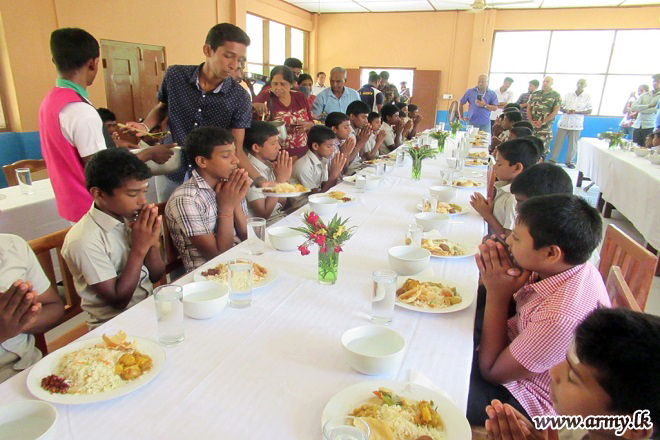65 Division troops as part of their community projects offered a hearty lunch treat to 47 children at ‘Mahadeva Swamihall’ Children’s Home at Selvanagar, Kilinochchi on Saturday (27).