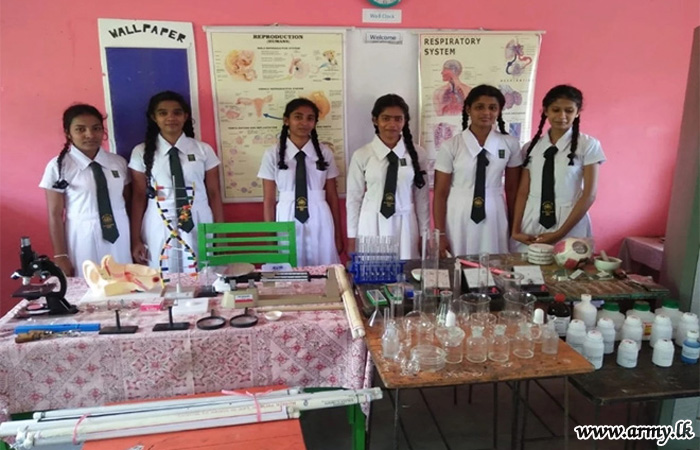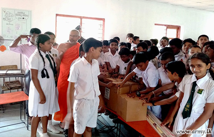 Following the generosity, extended by the US-based philanthropist, Mrs Lalani Wasantha Moragoda, 21 Division Headquarters of the Security Force Headquarters - Wanni (SFHQ-W) took steps to distribute a stock of school accessories, including instruments, needed for scientific learning among students at Sri Dhammarathana Vidyathana Pirivena, affiliated to the Madukanda Dalada Viharaya on Tuesday (30).