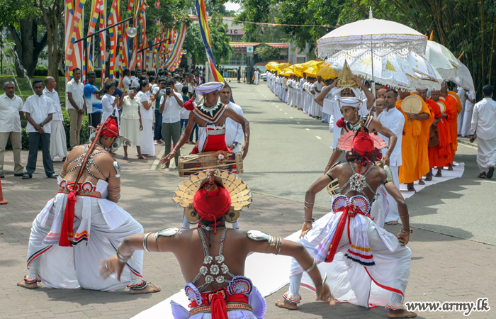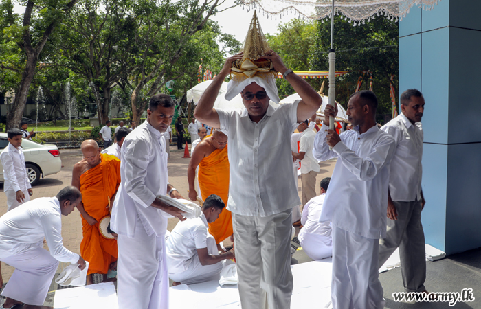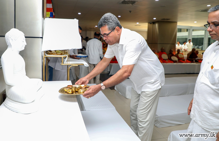 Members of the Maha Sangha on arrival at the premises were conducted in a simple procession and were invited to commence the formalities after Major General Munasinghe performed religious observances by lighting a coconut lamp.