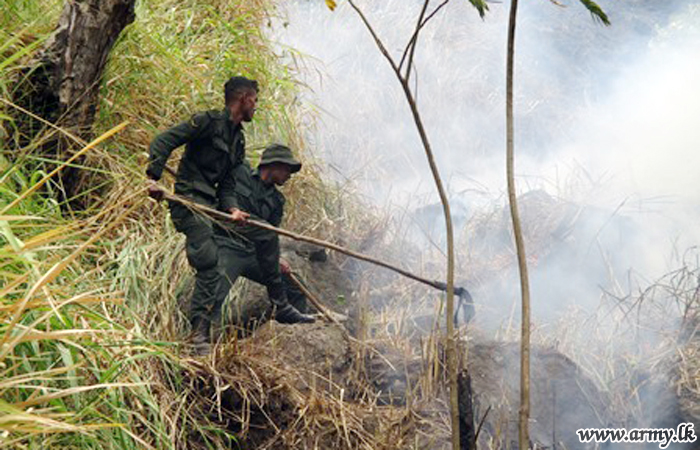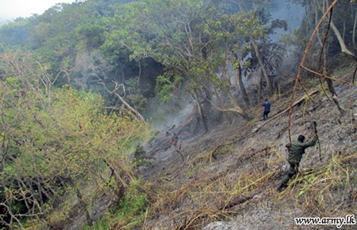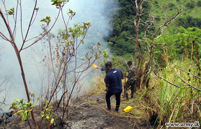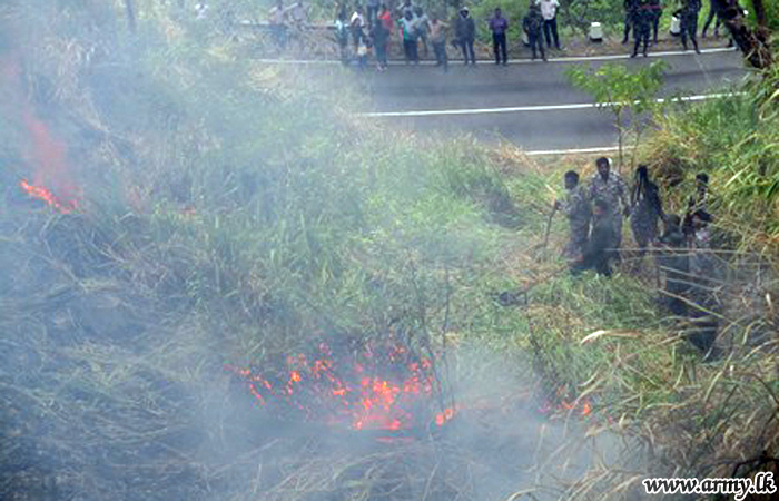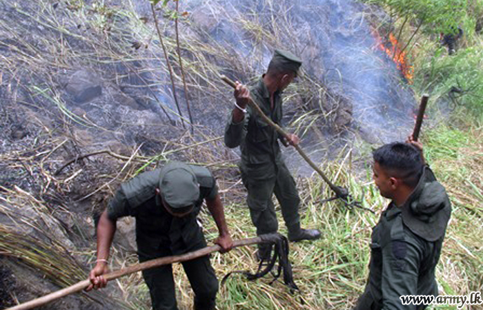 A group 27 troops of the 112 Brigade of the Security Force Headquarters- Central, including an Officer on being informed of a sudden bush-fire spreading across Ella rock area in Kumbalwela in Badulla district rushed to the location and helped other volunteers to extinguish it on Friday (23).