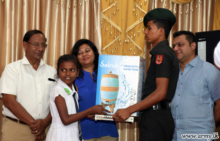 The Army coordination done through the 'Daham Pahana' project of Brother Charles Thomas enabled 255 school students in Jaffna to receive a large stock of school accessories, water purifiers, solar energy kits (light system) and coconut saplings following sponsorship provided by Mrs Chitra Satkunarajan and Ms Sara A. Abdulla from Bahrain.
