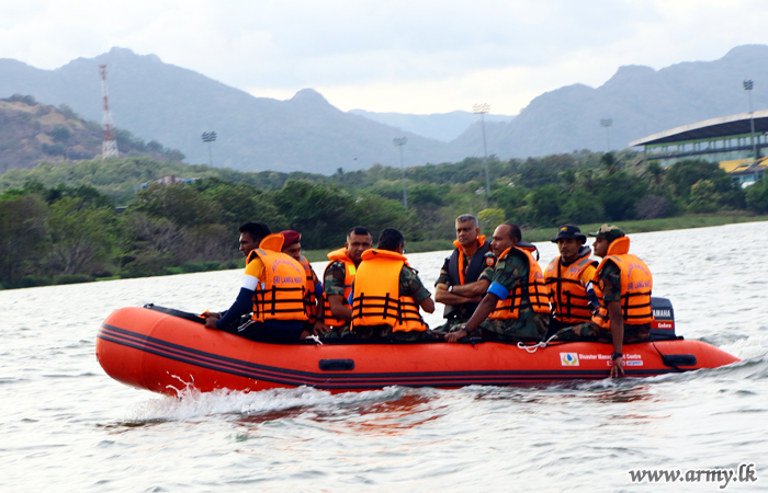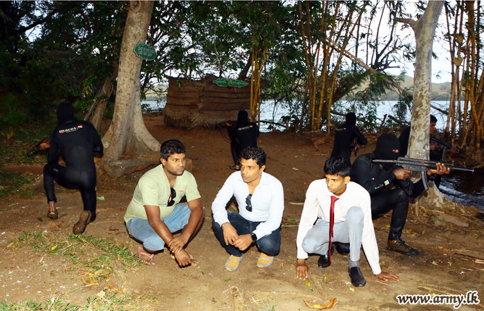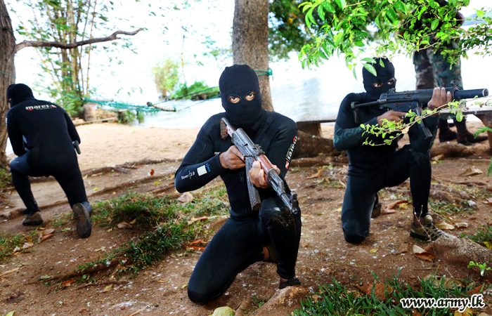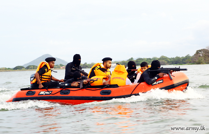 Ibbankatuwa Reservoir surroundings near Dambulla - Kurunegala main road this morning (12) bore all the hallmarks of a mini warfare when one more 5-hour long mock operation in the ongoing Field Training Exercise (FTX) ‘Cormorant Strike - 2019’ stormed an islet inside the Reservoir where terrorists were holding a team of Tourist Board officials to ransom.