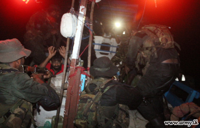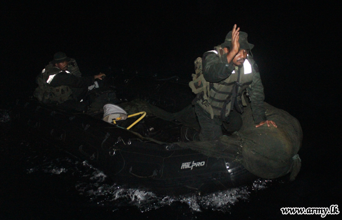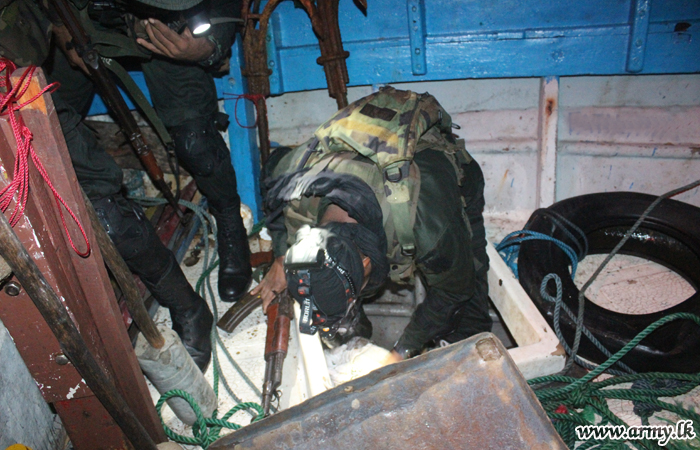 After intelligence confirmed that those explosives and warlike items are smuggled using fishermen's boats at sea, the naval, ground and air force troops in the Exercise without disturbing normalcy apprehended 5 suspects aboard two fishing boats with T-56 weapons, hand grenades and several satellite phones while they were sailing between Nilaweli and Kuchchaweli. |