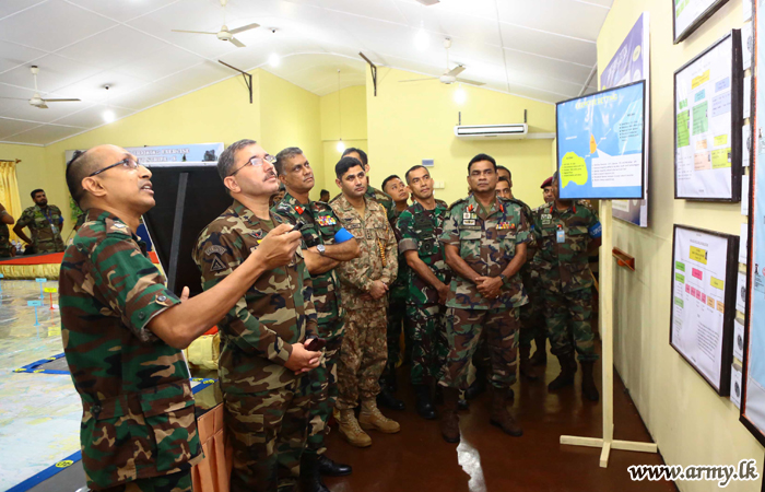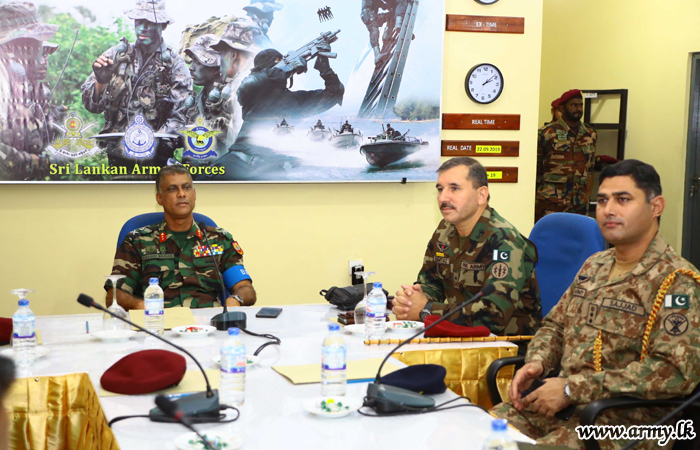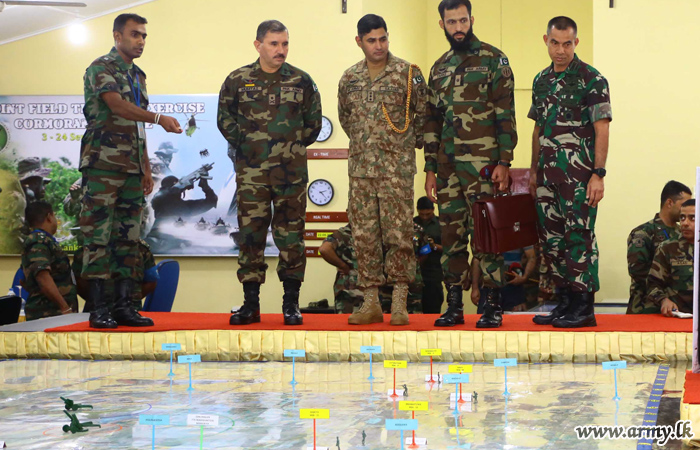 As the ongoing ‘Cormorant Strike - 2019’ reaching its climax, a day ahead of the final mock operation, Major General Hussain Mumtaz, General Officer Commanding, Special Service Group (SSG) of the Pakistan Army and the Defence Attaché of the Pakistan High Commission visited the ‘Exercise HQ’ premises at Minnerya this morning (22) and received a comprehensive briefing from the Exercise Director, Major General Laksiri Waduge and other Senior Officers, engaged in the Exercise.