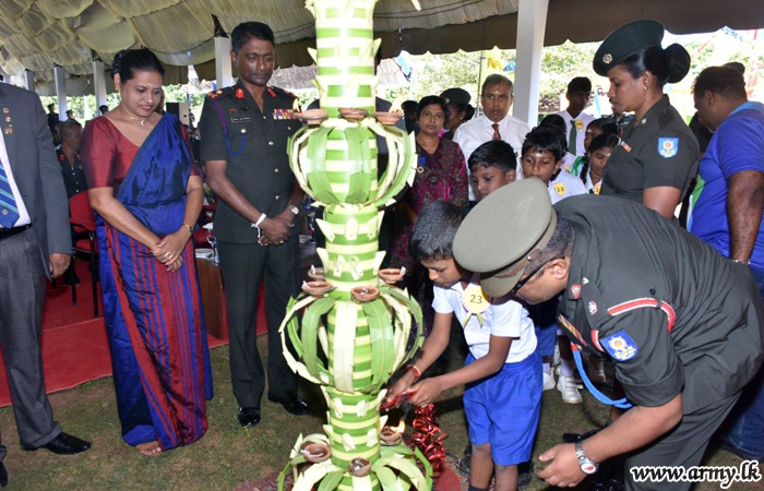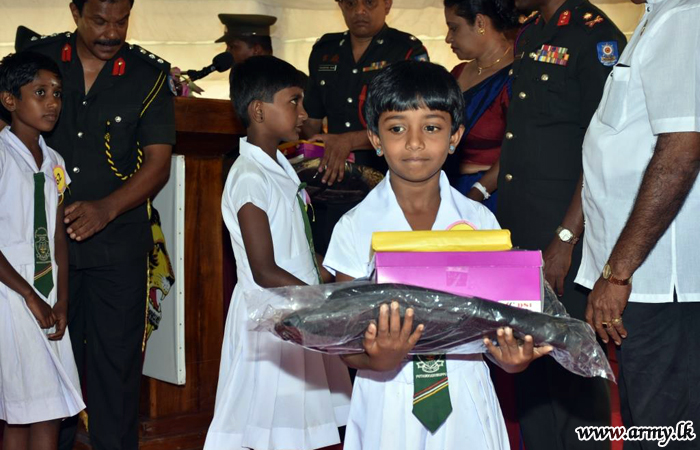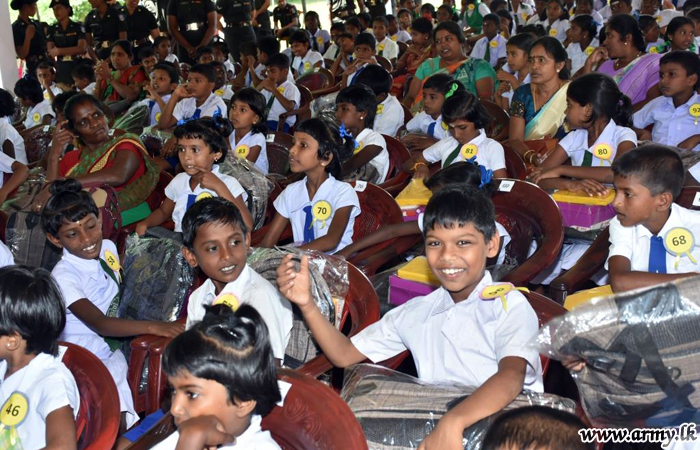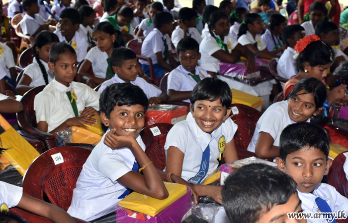 Lions Clubs of the International District 306 A-1 through the coordination of the General Officer Commanding (GOC), 68 Division, Major General A. S Ariyasinghe on account of the World Children's Day donated school accessories to 253 students of underprivileged families in Venavil Sri Murugananda Vidyalaya and Manthuvil Arasaratnam Vidyalaya in Mullaitivu area on Tuesday (1).