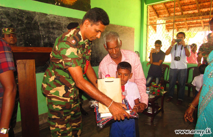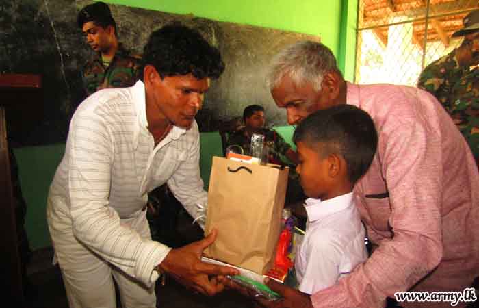 232 Brigade troops-deployed in Tharavikulam area on Wednesday (2) gave away a stock of school equipment, food items, uniforms and other essential accessories to 148 underprivileged students at Kulawadi Tharavei Shri Kalawaani Primary School at Kalkuda education division following an initiative taken by Colonel W.S.K Liyanawaduge, Commander, 232 Brigade.