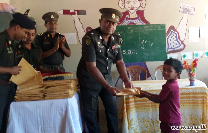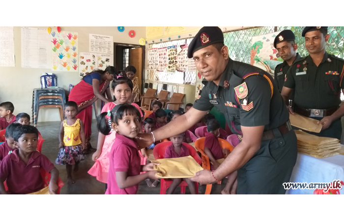 Troops of 20 (Volunteer) Vijaybhahu Infantry Regiment and 7 Sri Lanka National Guard (SLNG) troops, belonging to the 652 Brigade distributed school accessories among students at Anavilandankulam American Mission pre-school and M/A Amithiyapuram pre-school. 99 students received those incentives in the presence of 7 teachers.