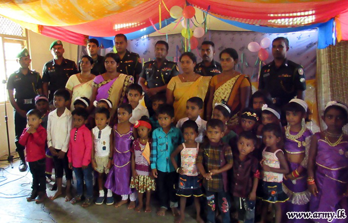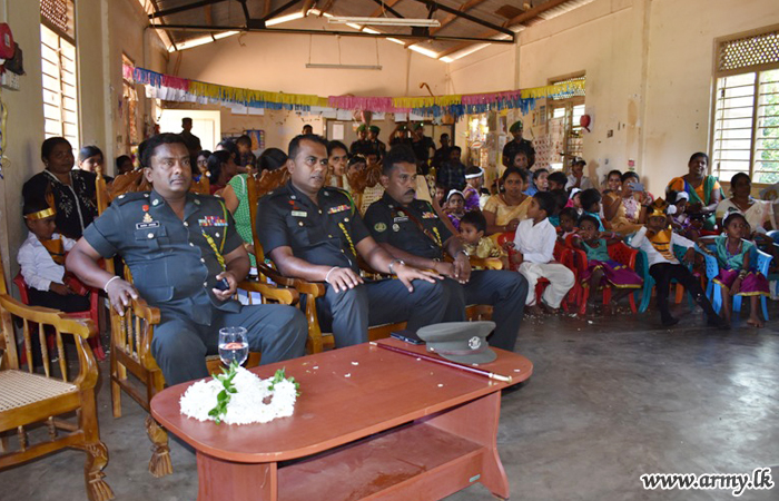 Troops of 11 (Volunteer) Gajaba Regiment belonging to the 651 Brigade organized a commemoration ceremony at Annai Theresa pre-school and gave away gift parcels to 35 kids, 4 teachers and 40 and civilians participated in the event.