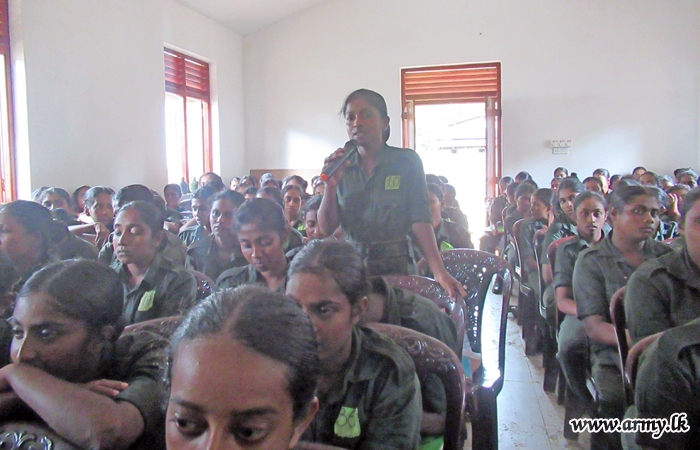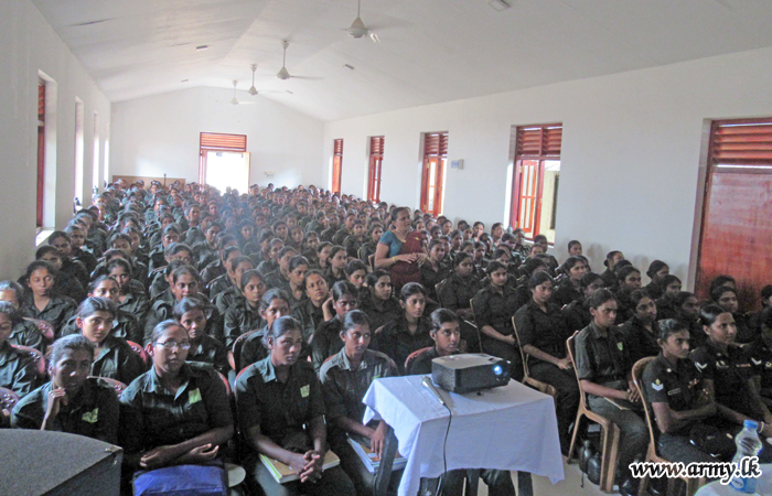 Newly-recruited 323 female soldiers at Sri Lanka Army Women’s Corps Recruit Training Centre in Sadunpura on Wednesday (16) listened to a lecture on 'Enhancing of Physical, Mental and Spiritual Stability’, organized by the Directorate of Psychological Operations as part of their training project.
