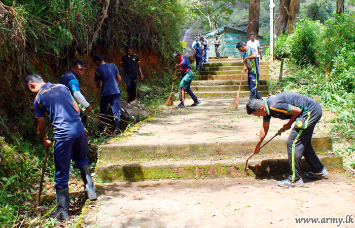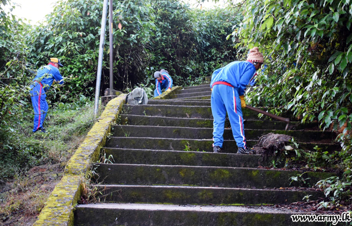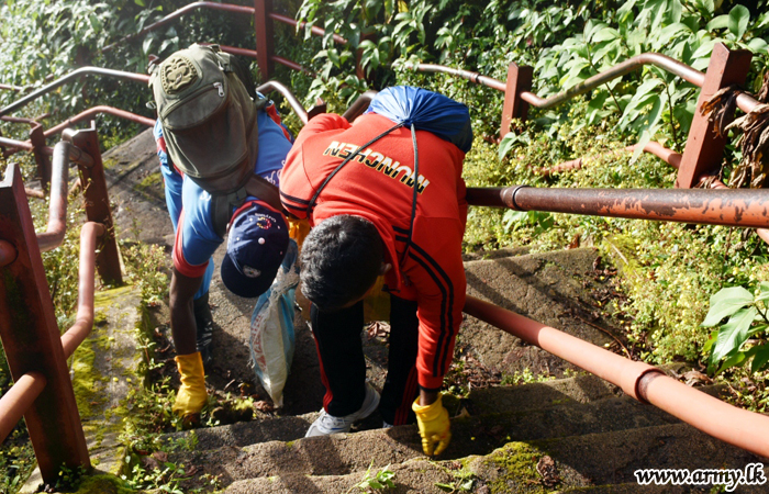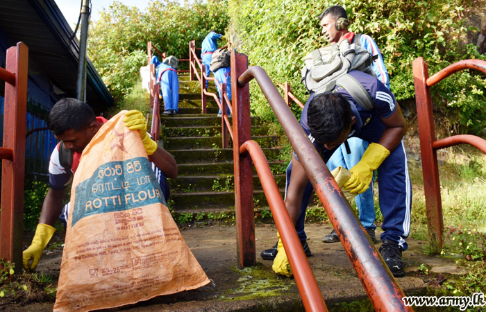 A total of 335 troops, including 35 officers from 111 Brigade, 112 Brigade and their Battalions under the Security Force Headquarters-Central on the guidelines given by the Commander of the Army carried out a mega cleaning project from Nallanthanniya up to the foot of the sacred Sri Paada peak on Monday (11). The project coincided with Friday's (8) inauguration of the new Army HQ.