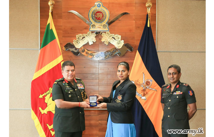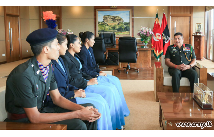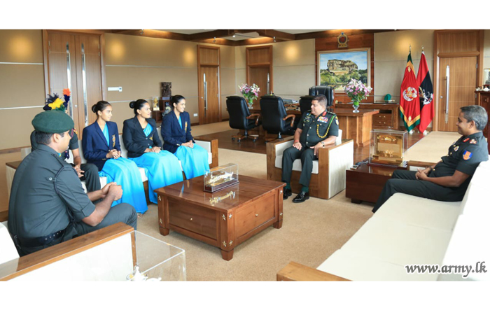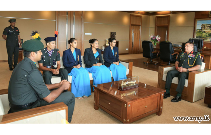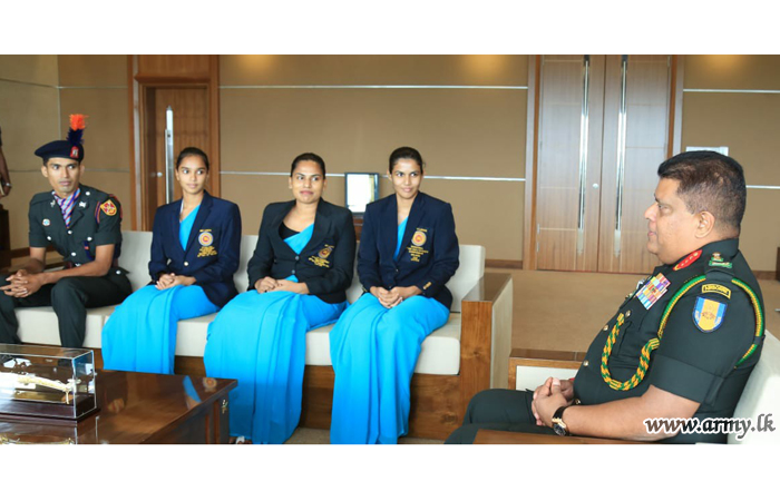 Lieutenant General Silva spoke to those 5 Army players and inquired into their readiness for the future event during the brief meet at the Commander's office. Rifleman K.S.S Perera of Sri Lanka Sinha Regiment, Private G. Gajanayake of Sri Lanka Army General Service Corps, Private K.K.M.T.S Fernando of Sri Lanka Army Women’s Corps, Private K.M.G Siriwardene of Sri Lanka Army Women’s Corps and Private K.D.D Gunawardena of Sri Lanka Army Women’s Corps are among those who received the Commander's blessings for their expedition.