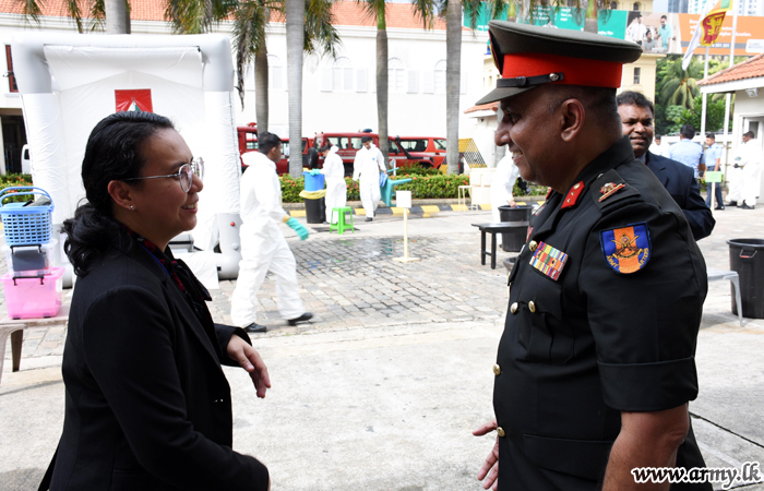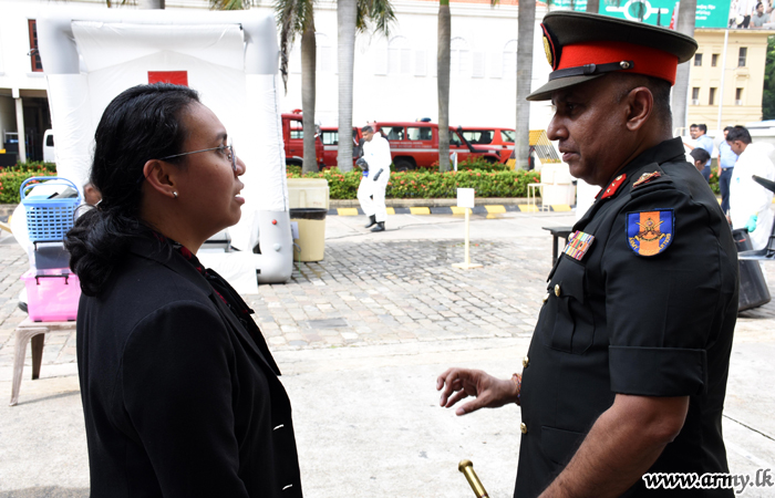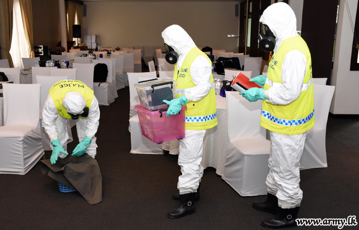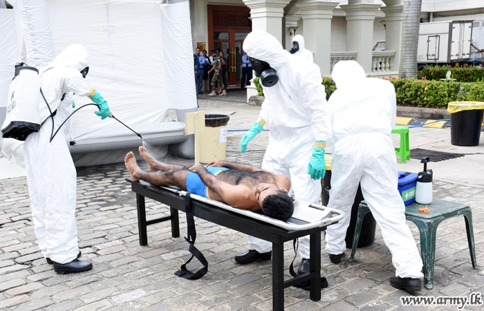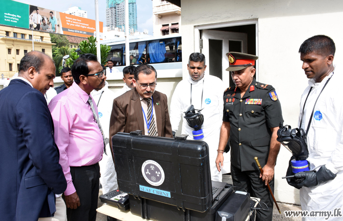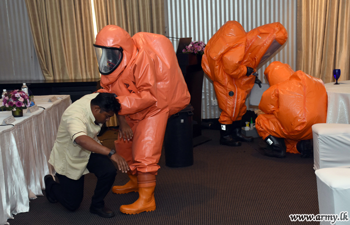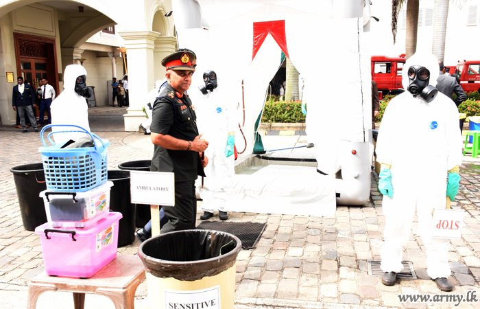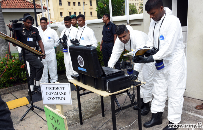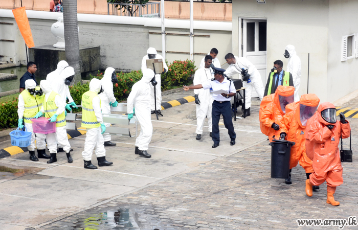 A Mock Demonstration conducted by Tri-Forces and Special Task Force and attended by foreign representatives, officials in the National Authority for Implementation of Chemical Weapons Convention, Government Officials and Regional members got underway at Galle Face Hotel on Thursday (05) in an attempt to refresh and update knowledge of the Chemical, Biological, Radiological and Nuclear (CBRN) squadron of the Army and teams of the Navy, Air Force and STF.