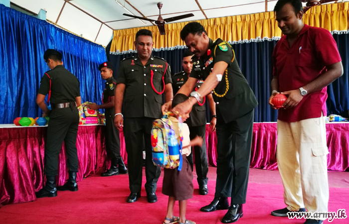 Troops of 14 (Volunteer) Sri Lanka Light Infantry (SLLI) serving the 621 Brigade with the support of the donors of Colombo Royal College and University of Sri Jayewardenepura recently gave away school accessories to 231 under-privileged students in 8 rural schools in the Welioya Divisional Education office area.