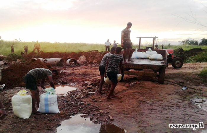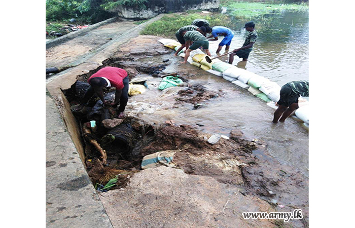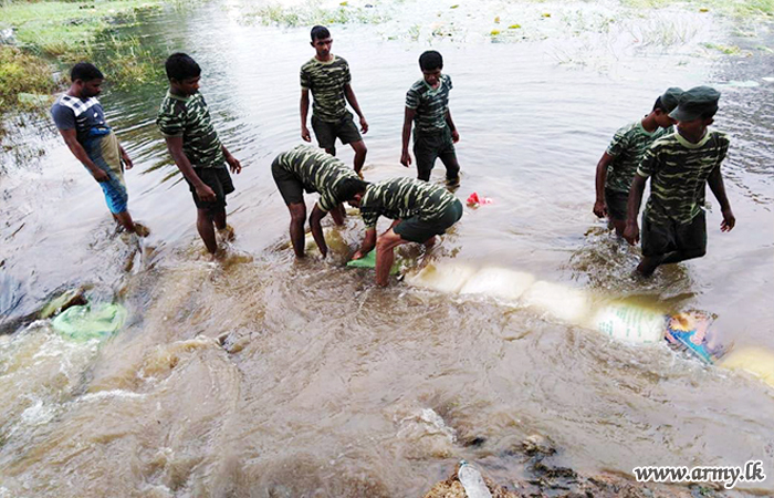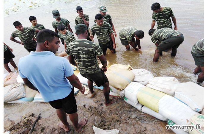 Troops of 20 Gajaba Regiment (GR) under the command to 622 Brigade of the 62 Division of the Security Force Headquarters - Wanni (SFHQ-W) laid sandbags to fortify the bund of Mutyankulam tank in Pulmoddai, together with officials of the Disaster Management Office at Kuchchaveli area, following heavy rains.