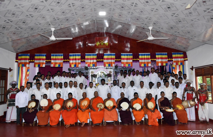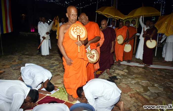 An all-night ‘Pirith’ chanting ceremony commenced on Friday (6) evening, followed by an alms-giving, the following morning (7). Major General W.D.C.K Costa, General Officer Commanding (GOC), 64 Division offering the traditional tray of betel to the members of the Maha Sangha invited them for chanting.