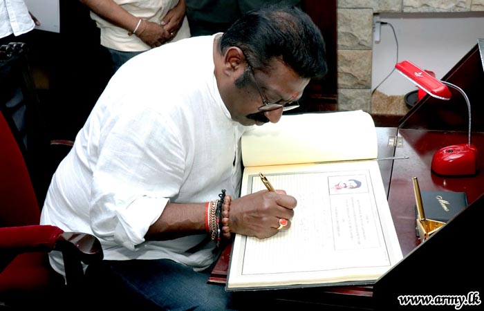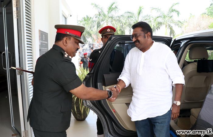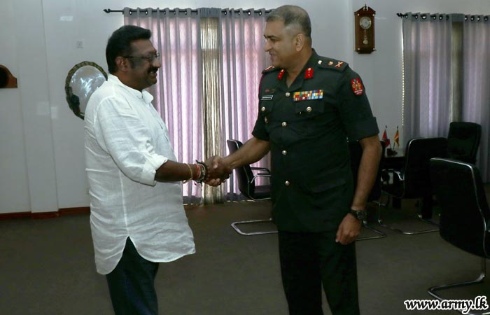 Commander Security Forces - Jaffna, Major General Ruwan Wanigasooriya on Saturday (21) briefed the visiting Hon Minister of Community Empowerment and Estate Infrastructure Development, Mr Arumugam Thondaman on the progress of Army-initiated reconciliation moves and ongoing community-oriented welfare projects in the peninsular when the latter made a courtesy visit to the Security Force Headquarters - Jaffna during a tour to the North.