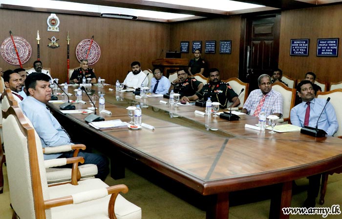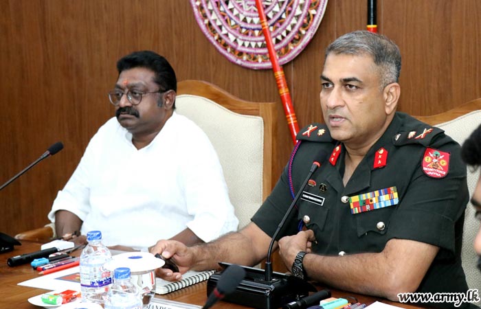 The meeting focused on the present progress of Reconciliation and Resettlement work, including land issues and the status-quo regarding Welfare Centers in the Jaffna peninsula. Further, the Minister and his staff received a briefing on the Army social welfare projects and assistance to the civil community in the peninsula.