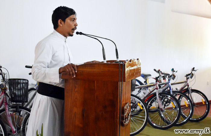 In order to stimulate students for studies and facilitate their routine movements, the 57 Division and the 573 Brigade jointly worked and received the support of a donor to provide bicycles to 10 needy school students during a brief ceremony, held at the Nawajeewanam Church in Murusamoddai on Tuesday (31) on account of the dawn of the festive season.
