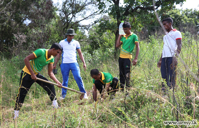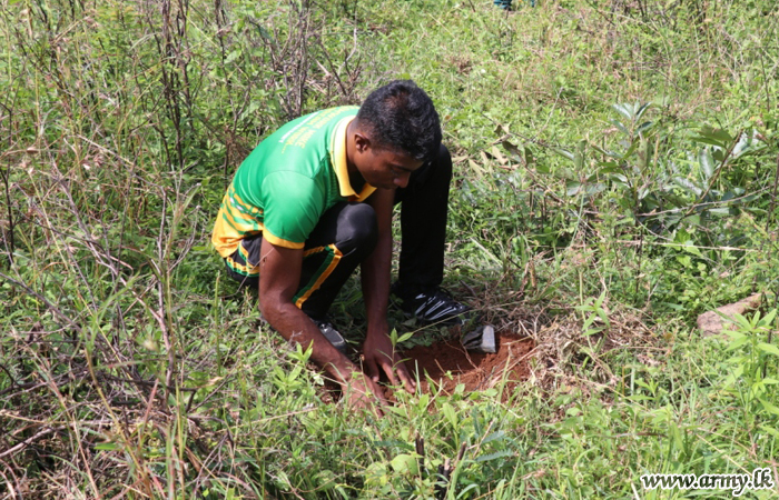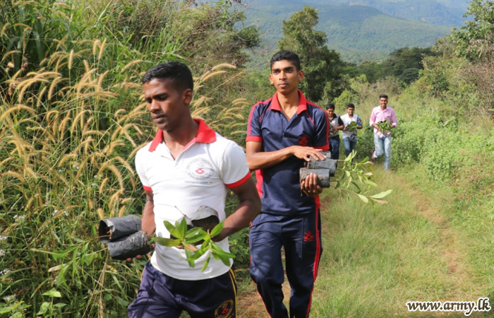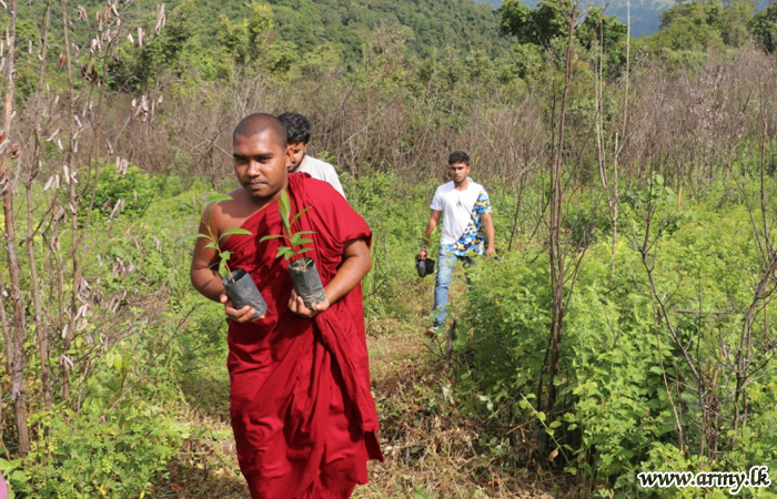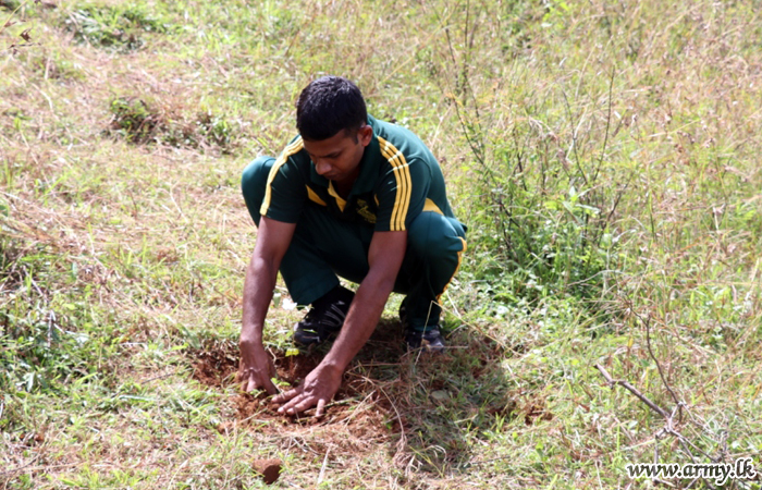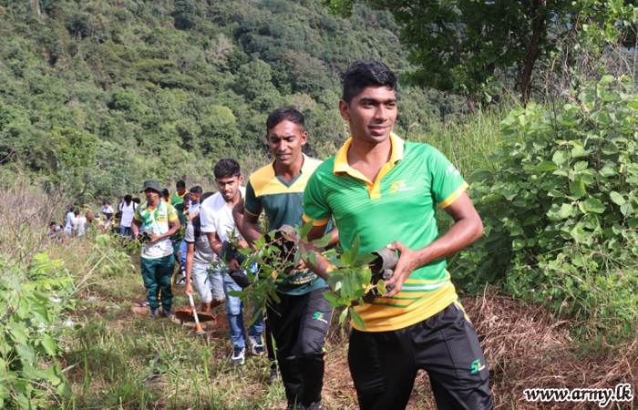 Troops of the 11 Division in Pallekele, Kandy under the Security Force Headquarters - Central giving a stimulant to the ongoing ‘Thuru Mithuru - Nawa Ratak’ project of the Army planted a total of 1000 ‘Mee’ and ‘Kumbuk’ saplings in the general area of Poppitiya, Ududumbara on Tuesday (31).