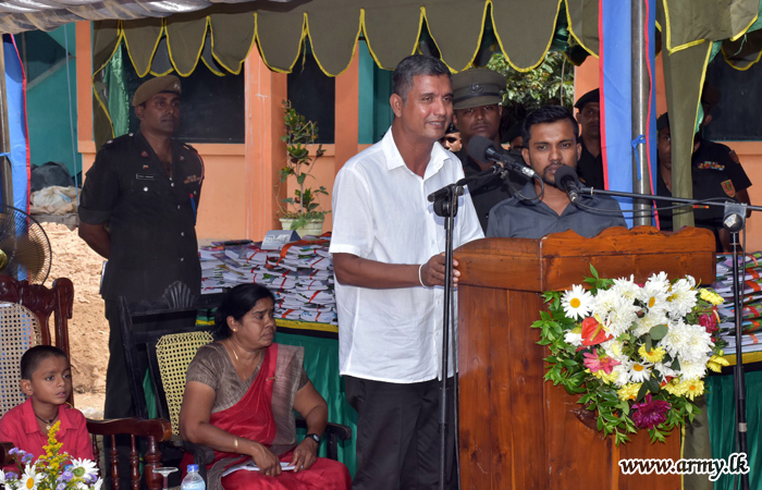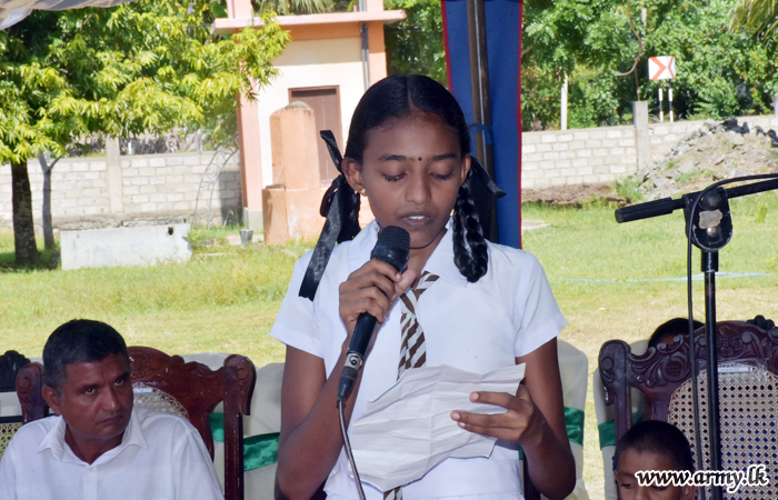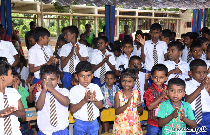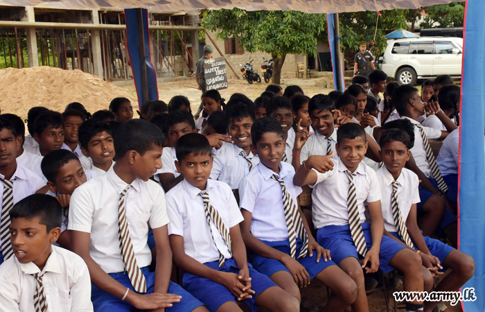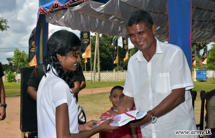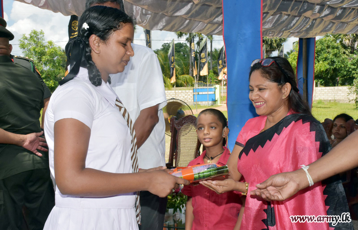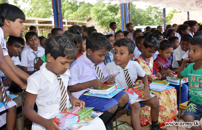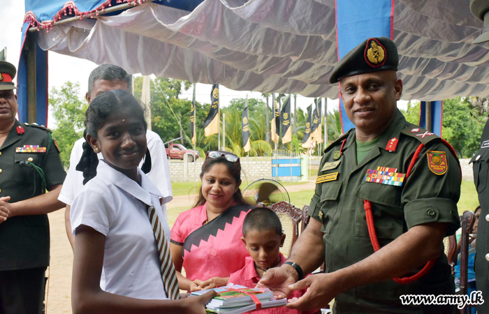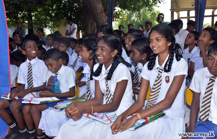 Lending a helping hand for promotion of education standards of poor rural students in the Kilinochchi region, the Security Force Headquarters - Kilinochchi (SFHQ-KLN) also joined the distribution of essential school accessories among 275 needy students, resident in the 573 Brigade area of responsibility on Monday (6) during ceremonies held separately at St. Anthony Roman Catholic School, Korakkankaddu and Tamil Mixed School at Wattakachchi South.