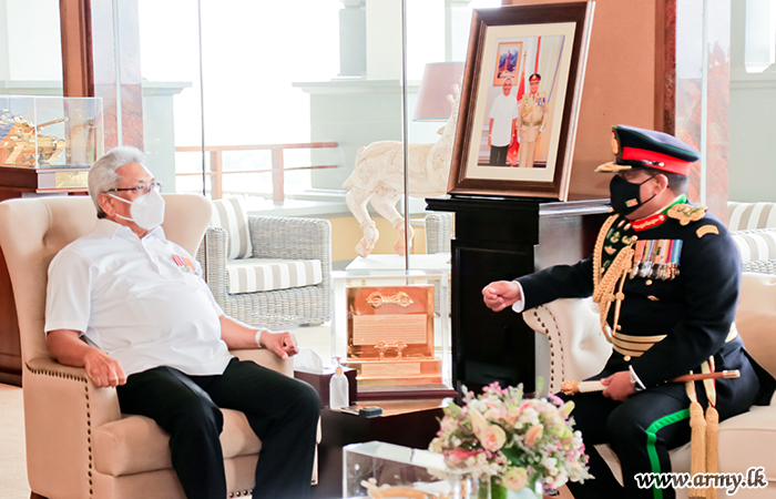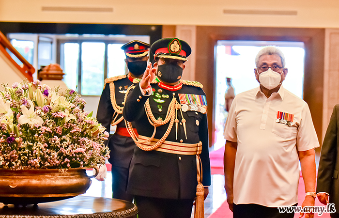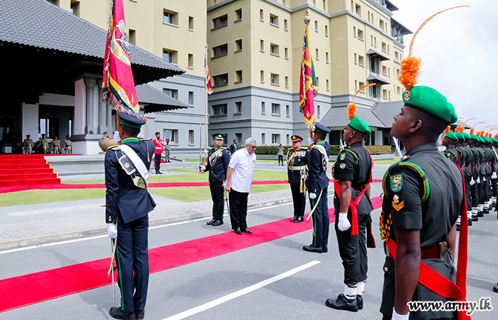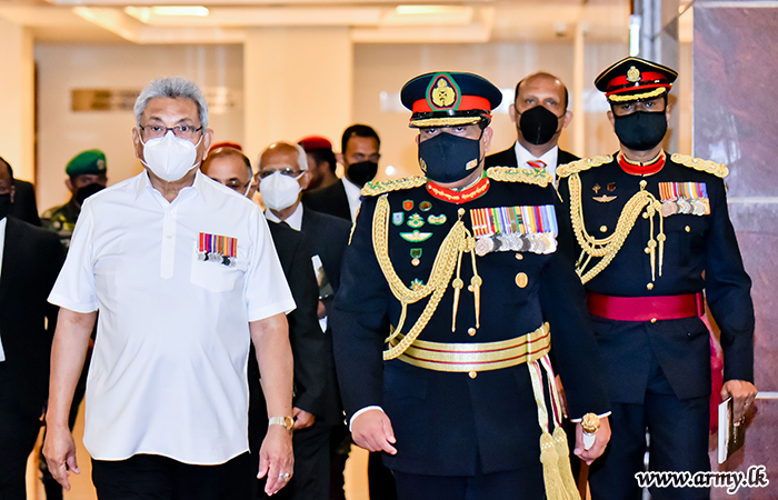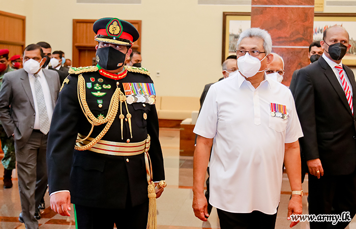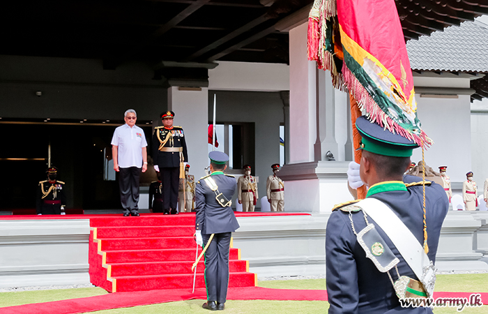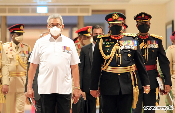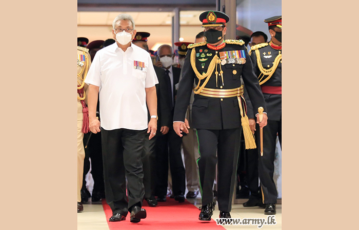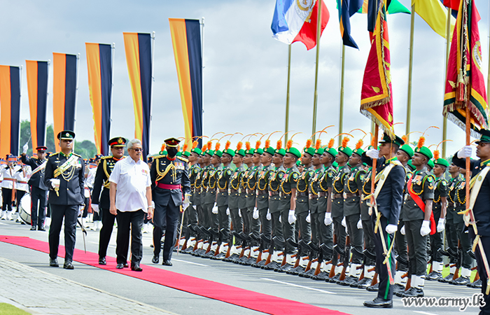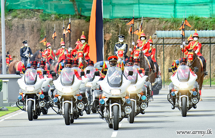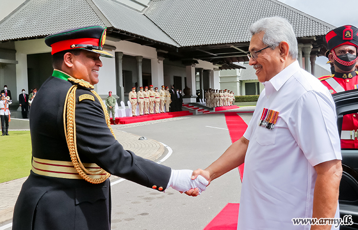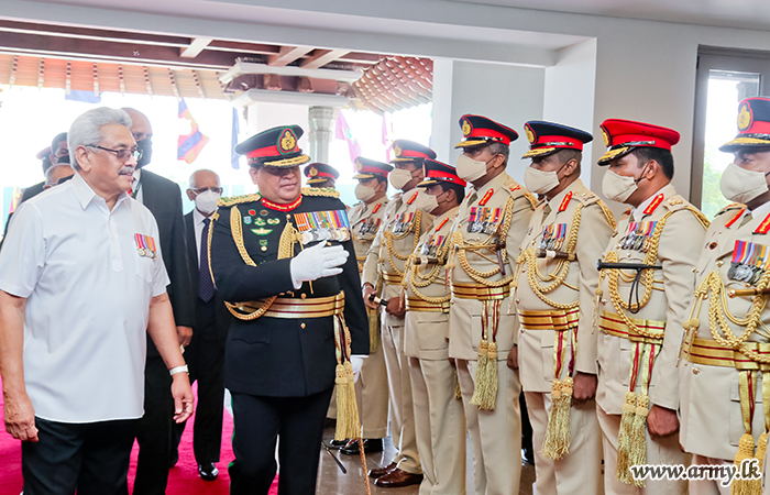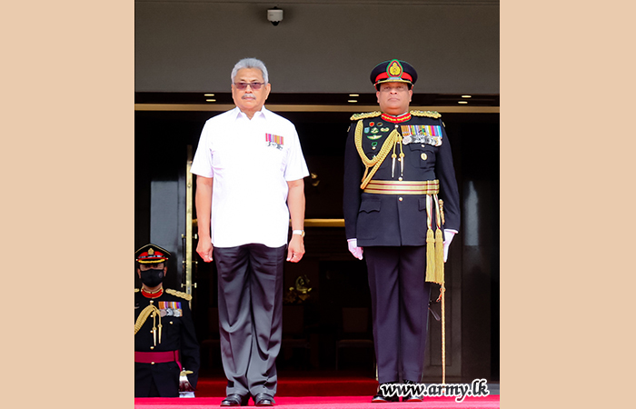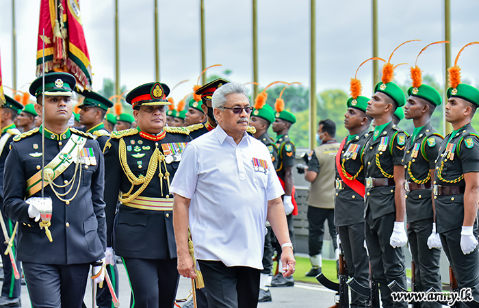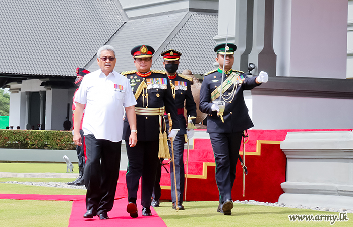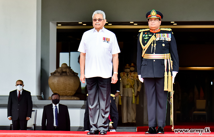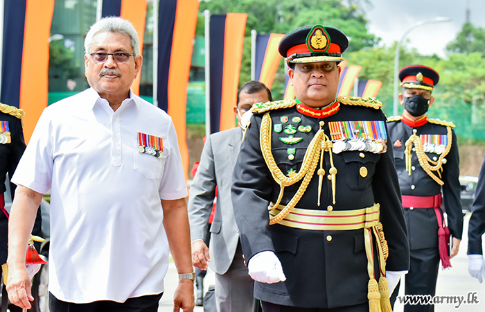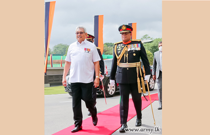 No sooner than the day's VIP alighted from the vehicle at the main porch, General Shavendra Silva received HE the President warmly and invited him to review the highest military salute, the Guard of Honour, presented by Gajaba Regiment troops, made up of 4 Officers, 96 Other Ranks, President Colours and Regimental Colours squads who had been quarantined for over a month after placing them in a bubble adhering to health procedures. The day’s Chief Guest, Head of the State, flanked by the host, General Shavendra Silva reviewed the parade closely and took the salute from the special dais.