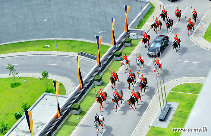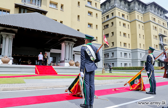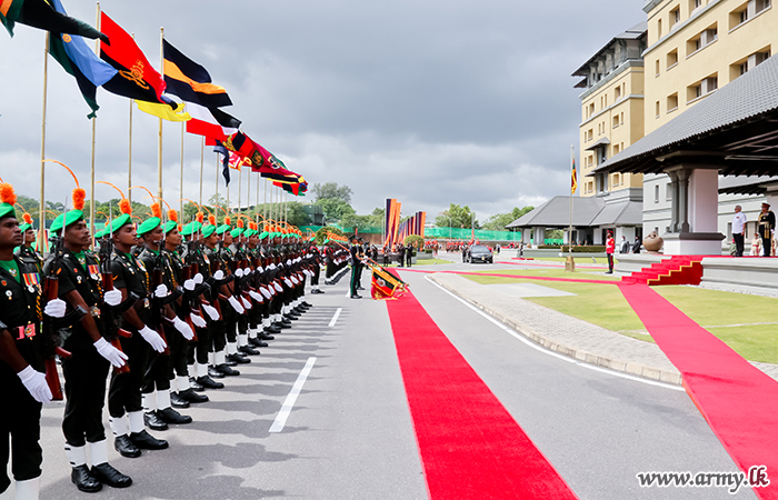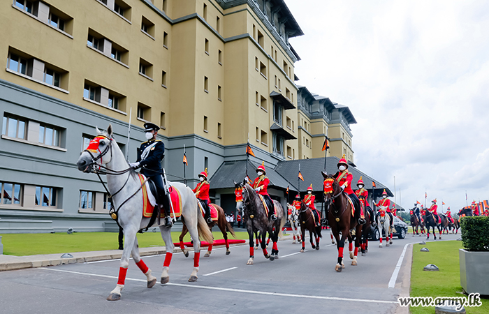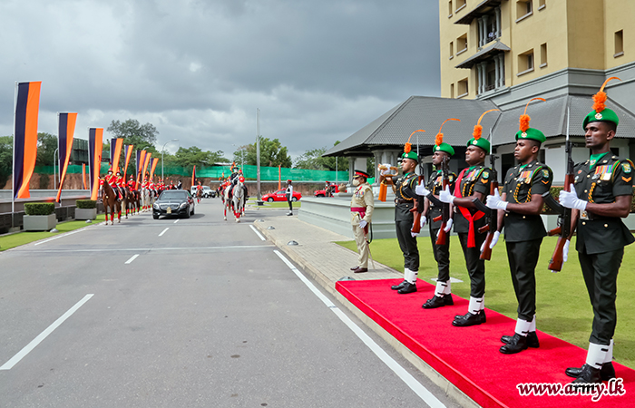 As the clock struck 10.00 am, the motorcade carrying HE the President, preceded by mounted horse riders entered the Army HQ main entrance as troops in a drive-past Guard Turnout salute greeted the visiting Commander-in-Chief of the Armed Forces, HE the President, attaching due respect to the Head of the State who was making his maiden visit to the Defence HQ complex as the Head of the State.