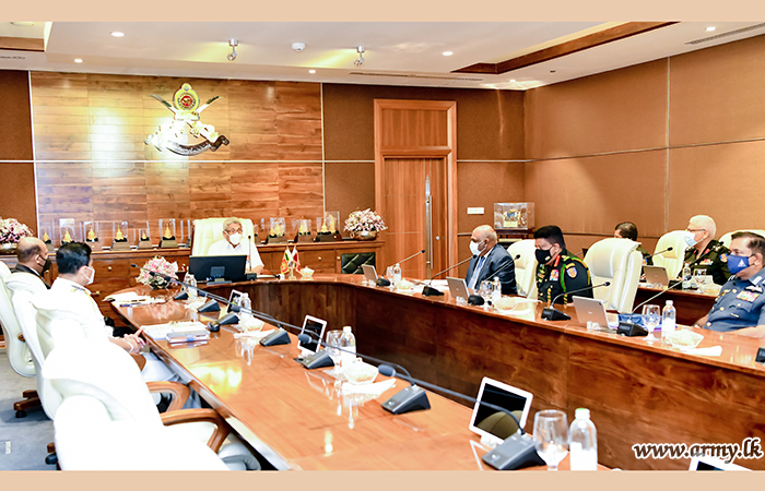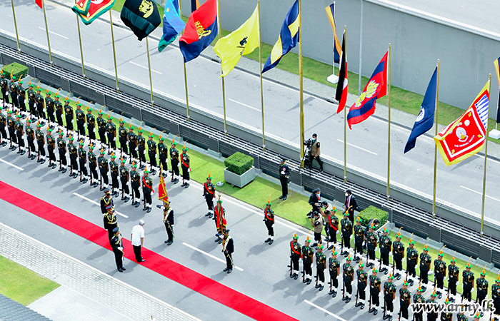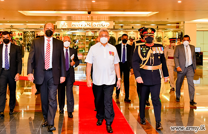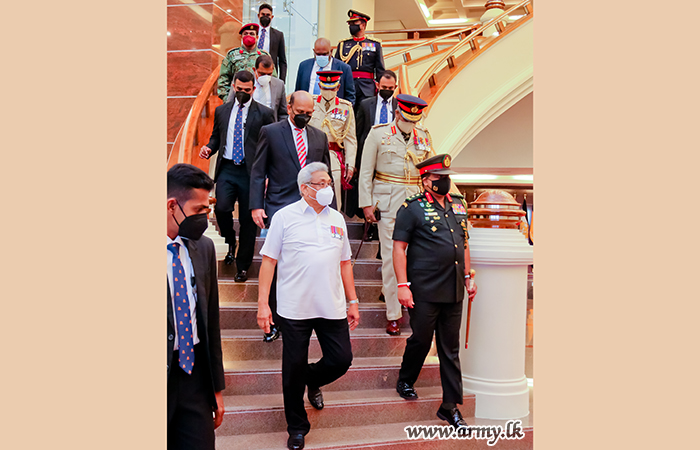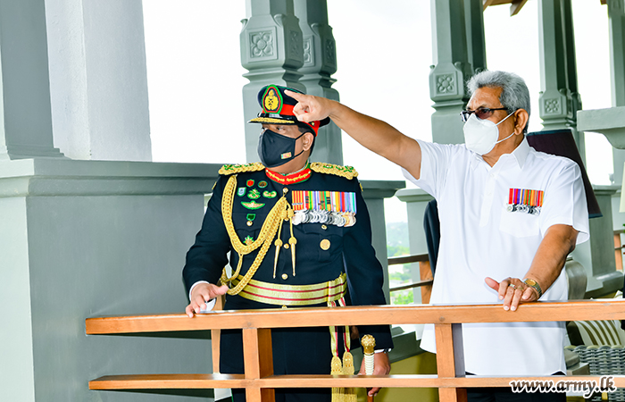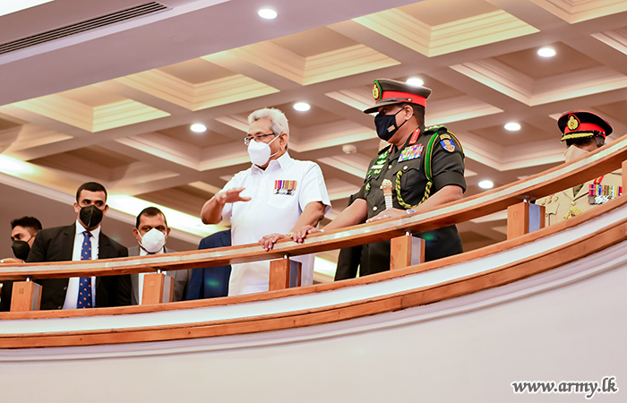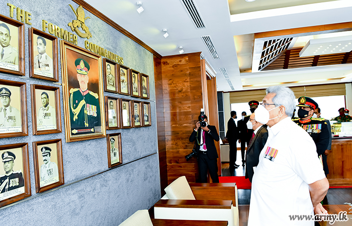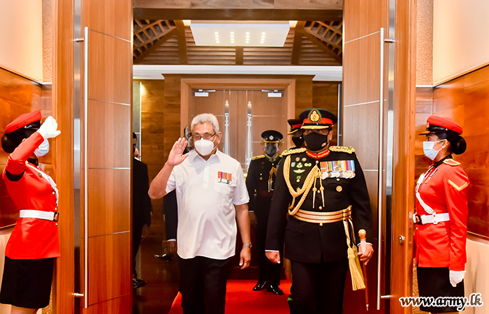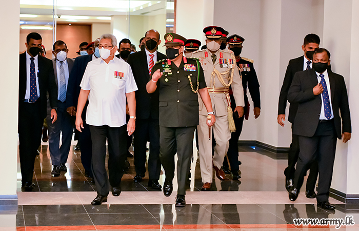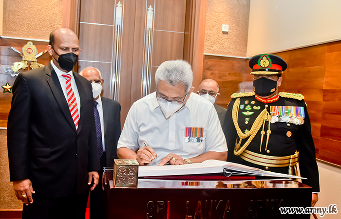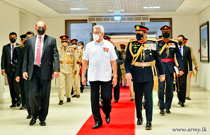 His Excellency (HE) the President Gotabaya Rajapaksa, Commander-in-Chief of the Armed Forces cum the conceptual brainchild behind the erection of the new state-of-the art Defence HQ complex at Sri Jayawardenepura who saw the fruition of the project, called at the Army HQ this morning (3) for the first time at the invitation of the Chief of Defence Staff and Commander of the Army, General Shavendra Silva to be received in a dignified red-carpet welcome, adorned with military salutes.