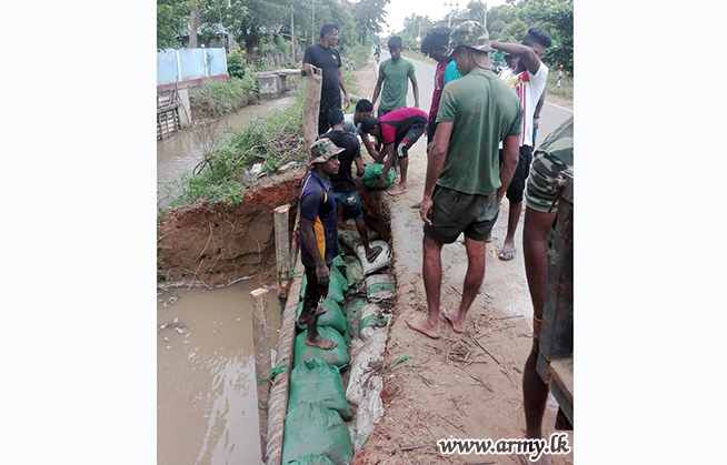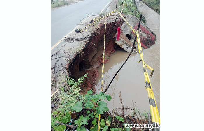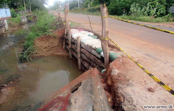 682 Brigade troops in order to avert further erosion, stacked sand bags and used timber and other accessories as precautionary measures. Road Development Authority after that repairs done by the 682 Brigade troops gave the green light for vehicle movement along this busy road. |