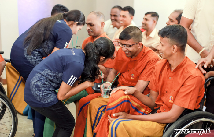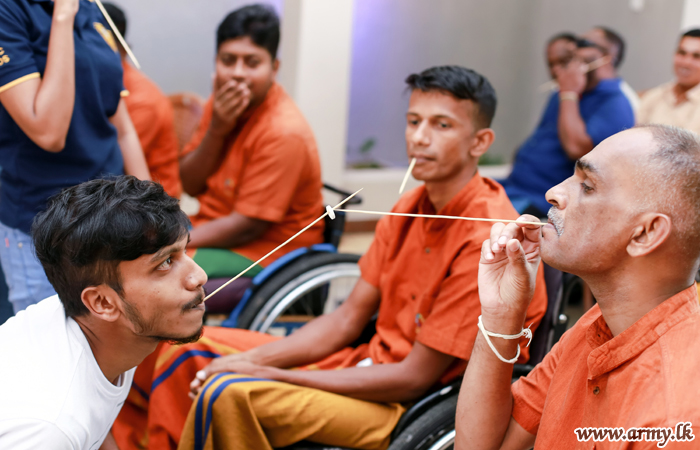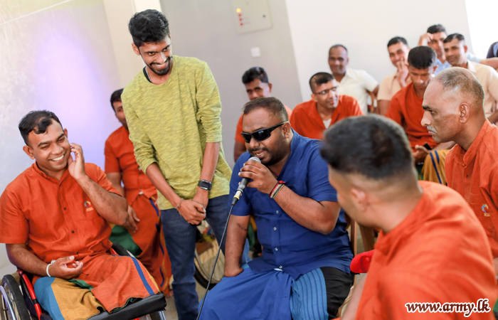 1 Sri Lanka Sinha Regiment music band from Ambepussa provided rhythmic beats and melodies inviting visitors and inmates to the dancing floor. Singing and dancing spirits dominated the entire wellness resort and brought a festive milieu with outbursts of laughs and joy-making.