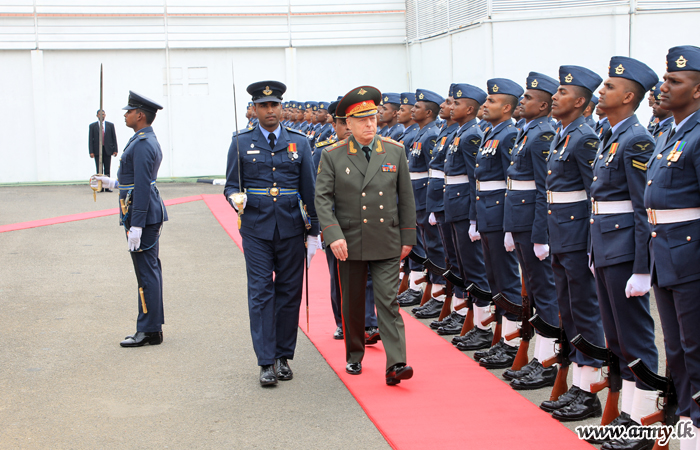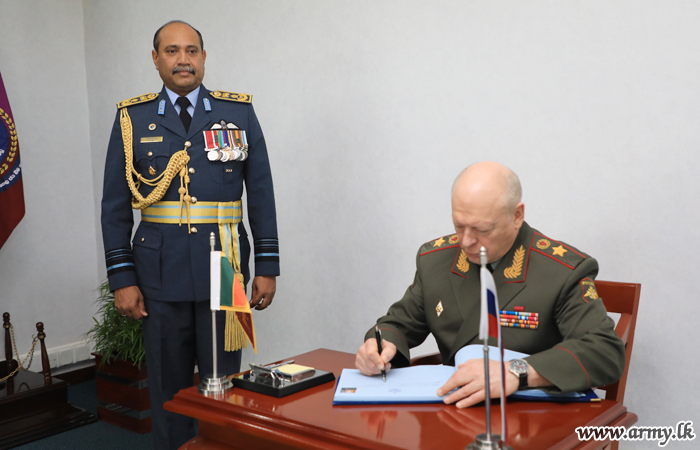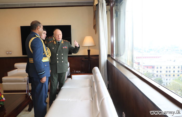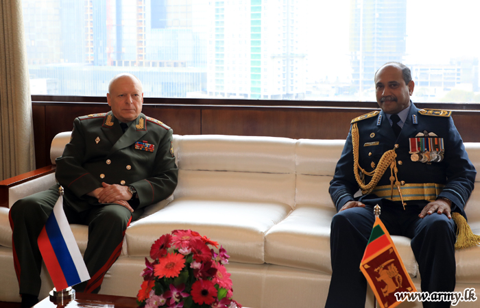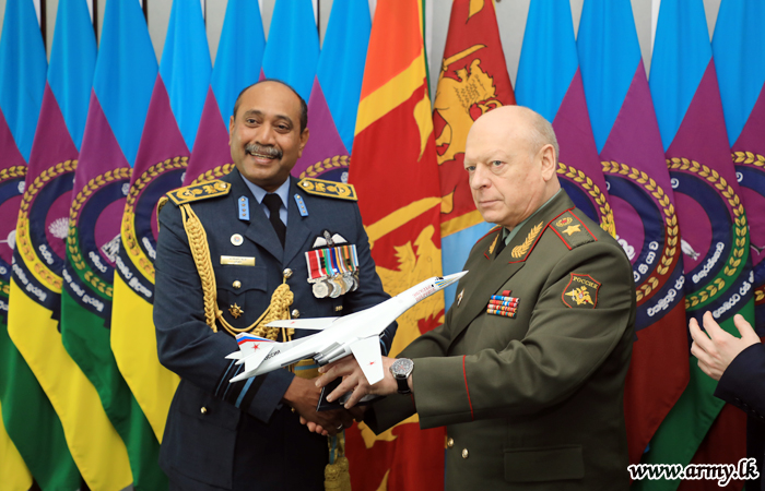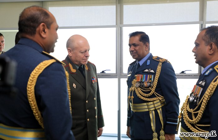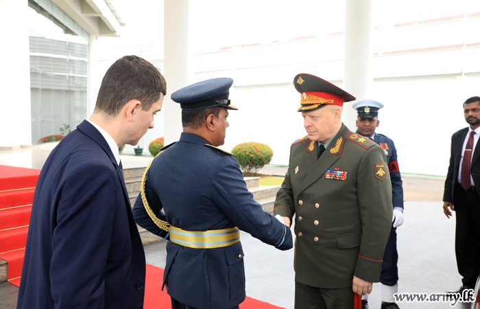 The Commander-in-Chief of the Land Forces, General of the Army, Oleg Salyukov of the Russian Federation paid a courtesy call on the Commander of the Air Force, Air Marshal Sumangala Dias at the Air Force Headquarters Colombo on Wednesday (5) morning. He was accorded a Guard Turnout and a Guard of Honour after he was warmly received by the Commander of the Air Force on arrival.
