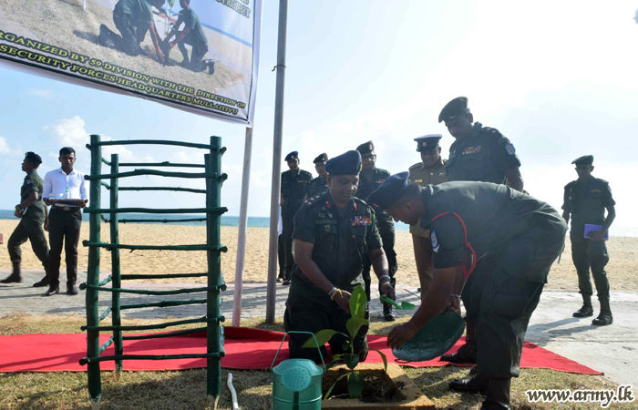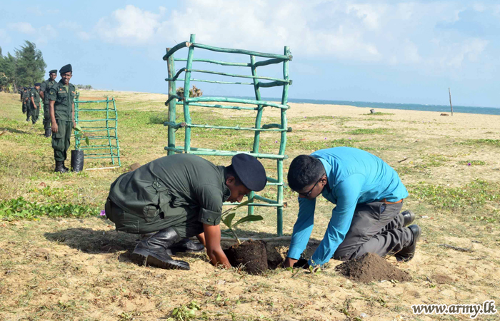 Brigadier General Staff (BGS), SFHQ-MLT attended the community project, together with the troops and completed the task on account of the 72nd National Independence Day. On Monday (3), 591 Brigade troops of the 59 Division, together with Commanders in 592, 593 and Commanding Officers in under command units planted more than 1,000 saplings of ‘Mudilla’, ‘Araliya’, ‘Margosa’ and ‘Domba’ along the beach patch from Mullaittivu to Kokilai (34.5km) in order to conserve the beach front.
