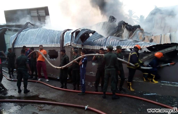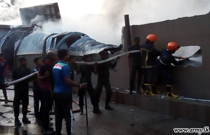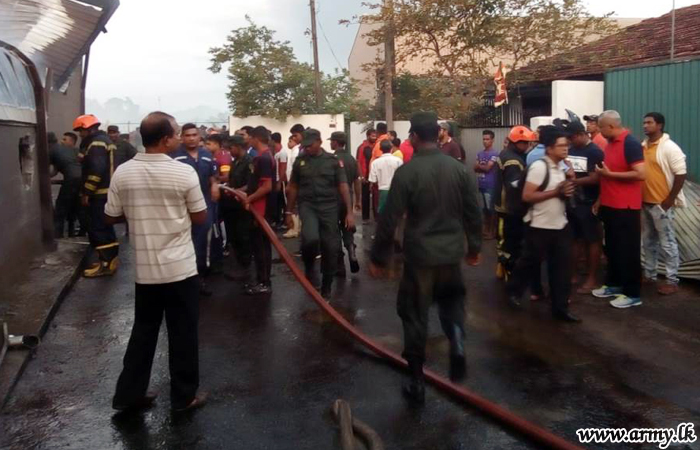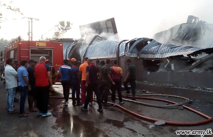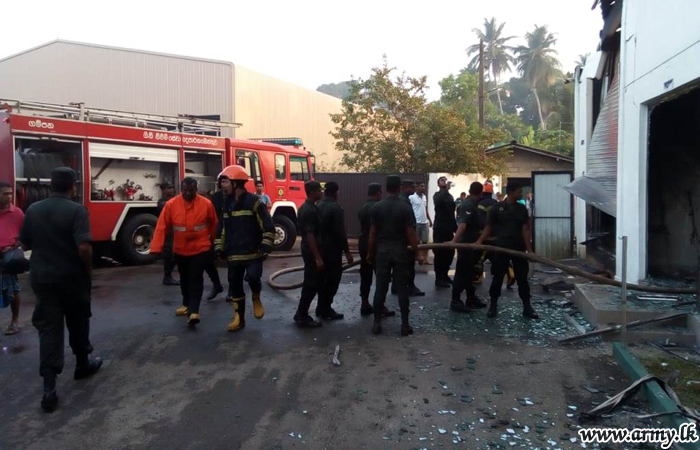 Alert to a sudden outbreak of a fire in the coconut oil-producing 'Randeniya Virgin Mills' factory in Batepola, Gampaha area on Sunday (9), 141 Brigade troops, together with fire fighters in Gampaha rushed to the scene and brought it under control.