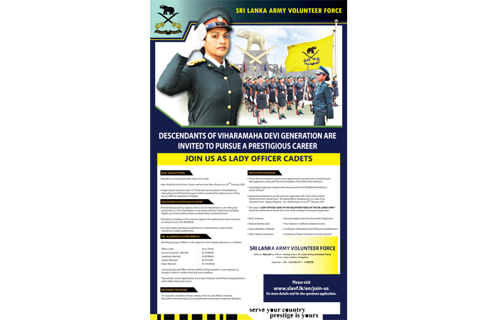 Sri Lanka Army Volunteer Force (SLAVF) calls for applications for enlistment of Lady Officer Cadets of not more than 24 years of age by 20th February 2020. The applicants should also possess two passes in the G. C. E. (A/L) examination in one sitting and passed the G. C. E. (O/L) examination in two sittings with 4 credit passes including English and at least ordinary passes for Mathematics, Sinhala/Tamil languages. Click here for more information. |