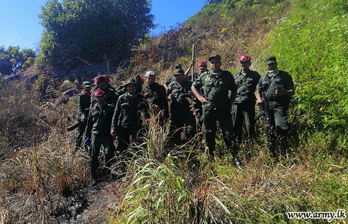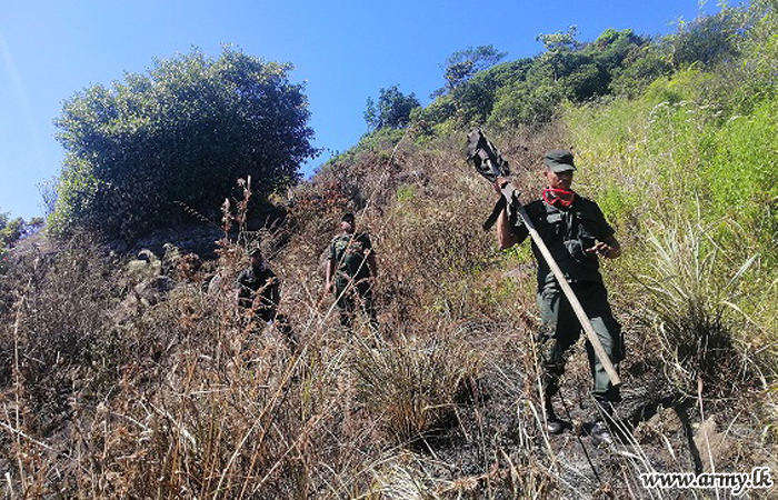 2 (V) Sri Lanka Sinha Regiment (SLSR) troops of the 111 Brigade HQ of 11 Division under the Security Force Headquarters - Central (SFHQ-Cen) on Monday (10) hurried to the Hantana mountain peak in the Uduwela Divisional Secretariat and extinguished a bushfire that was fast spreading.