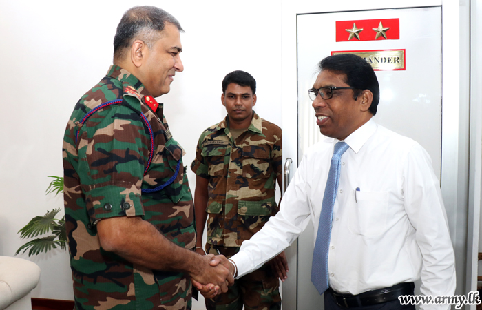 The newly-appointed District Secretary for Jaffna, Mr Kanapathipillai Maheshan on Tuesday (18) paid a courtesy call on the Commander, Security Forces - Jaffna, Major General Ruwan Wanigasooriya at his office at the Security Force HQ - Jaffna (SFHQ-J).